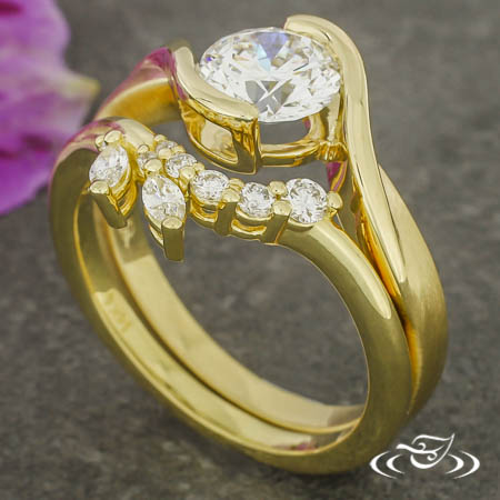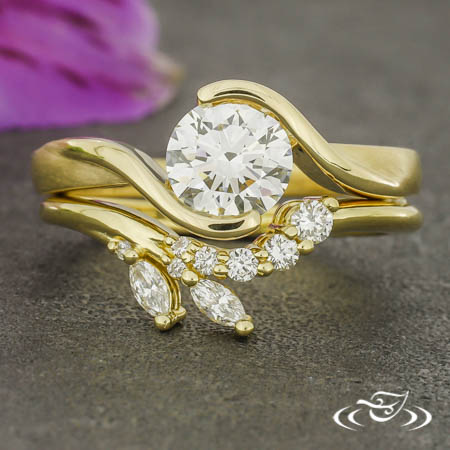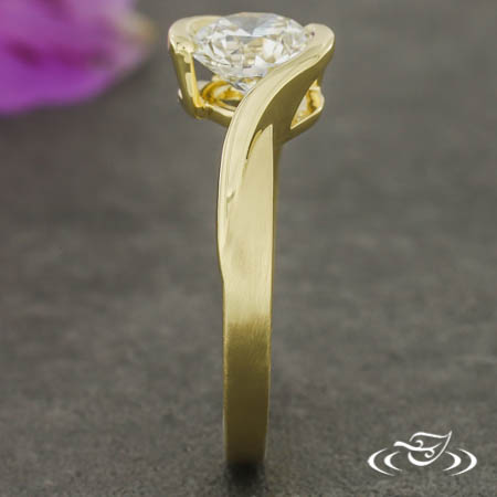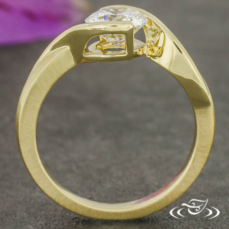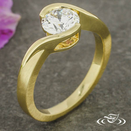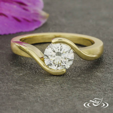 Custom 14kt yellow gold bypass style ring holding a polished, half bezel set GLJW provided round lab diamond center stone. This ring also has a round curve taper shank with a matte finish.