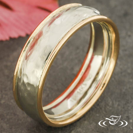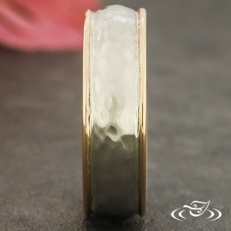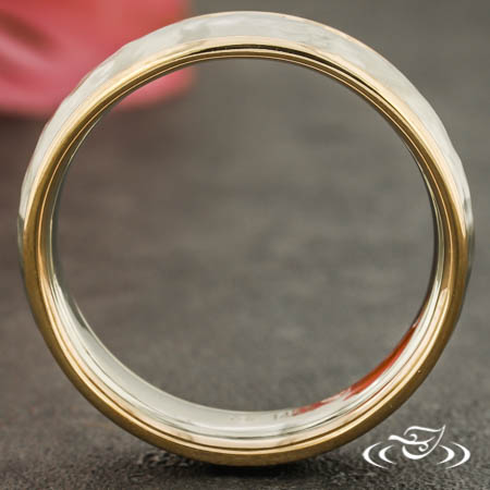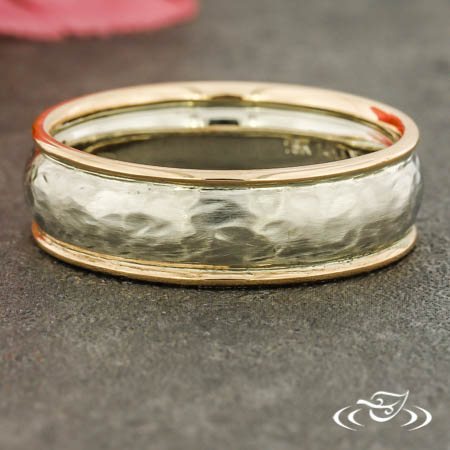 2-tone comfort fit band with a 5mm wide 14k white gold center section and ~1mm wide 18k round rose gold side rails. The center section has a hammered matte finish while both rails are high polished.