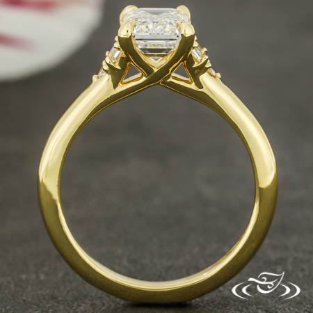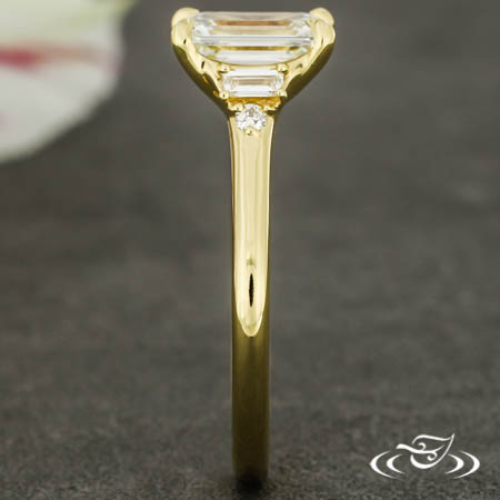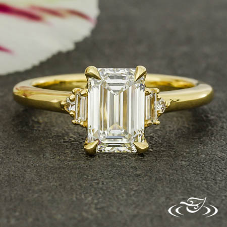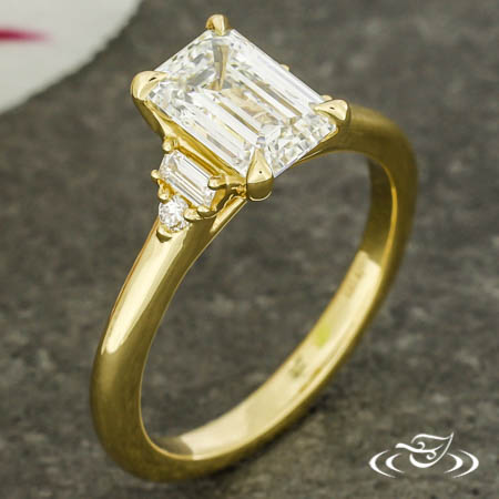 Custom 18kt yellow gold ring holding a 4-prong set GLJW provided emerald cut lab diamond center stone flanked by (2) GLJW provided baguette lab diamonds and (2) bead set GLJW provided round lab diamonds. This ring also has a round shank and a high polish finish.