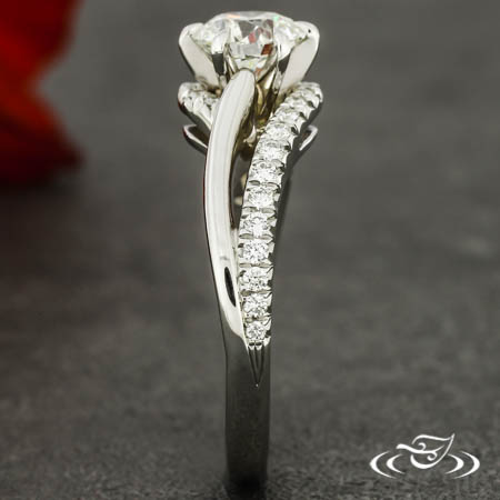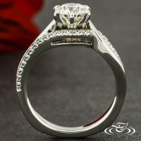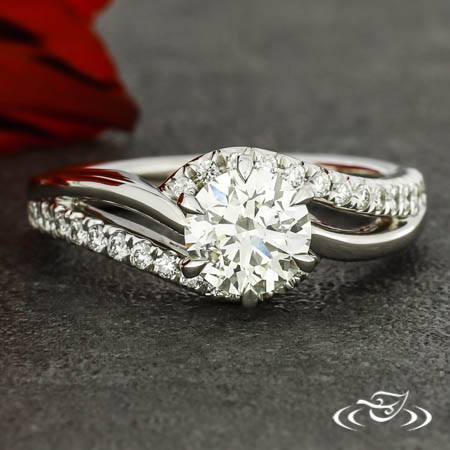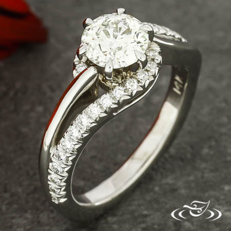 Warranty Remake: Custom rhodium plated 14kt white gold ring holding a 6-prong set customer provided round diamond center stone. This ring also has a pierced two strand bypass shank with (30) customer provided round diamond stones French set on top face of one strand going 1/2 way around. This ring also has a round in/square out shank and a high polish finish.