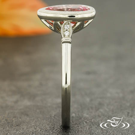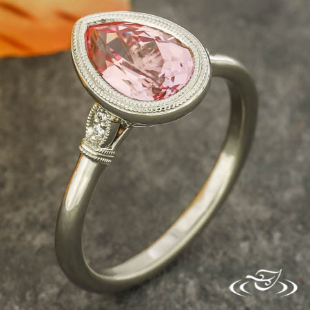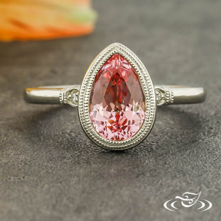 Custom 14kt white gold ring holding (1) bezel set GLJW provided pear cut peach lab sapphire center stone framed by a double halo of milgrain. Each shoulder is comprised of a marquise shaped metal element followed by a raised horizontal ribbon. Both marquise shaped elements hold (2) bead set GLJW provided round cut lab diamond melee and are framed in milgrain. The remainder of the ring has a round domed shank. High polish finish.