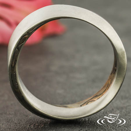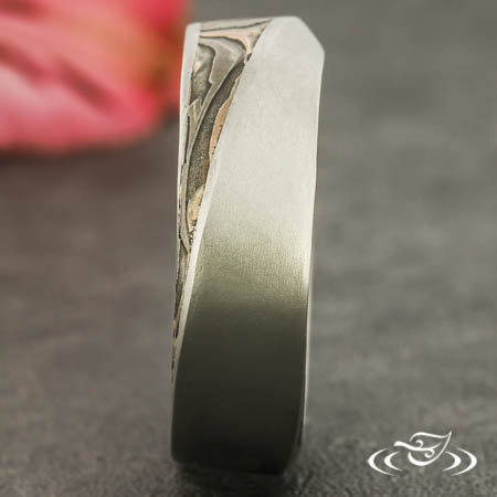 Matt and Linden’s matching wedding bands are a stunning reflection of the balance and unity in their relationship. Each ring is a custom Mobius band, crafted from 950 platinum to form one half of the elegant twist. The other half is a hand-fabricated Mokume Gane inlay, composed of 14k palladium white gold, 14k rose gold, and sterling silver. The intricate pattern of the Mokume Gane, etched and accented with blackened sterling silver, tells a story of intertwining lives and enduring love. Finished with a matte texture, these bands are a perfect representation of timeless beauty and shared devotion, much like the couple they were made for.