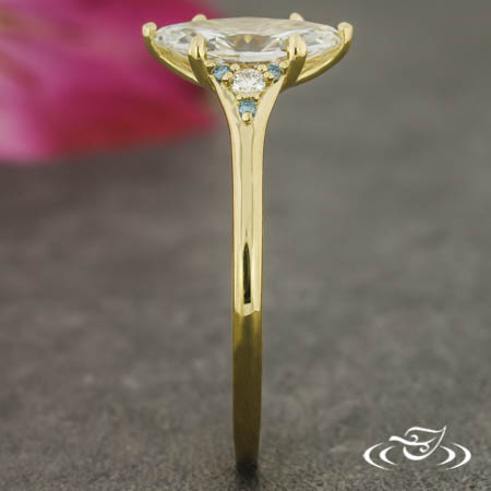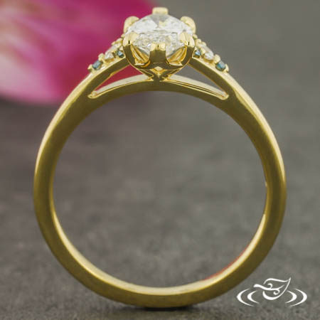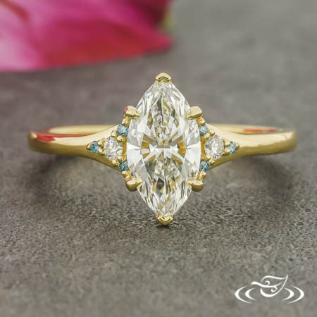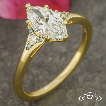 Custom 18kt yellow gold ring holding (1) GLJW provided marquise cut lab diamond center stone 6-prong set with chevron prongs on the pointed ends and rounded prongs on the sides. Each tapered shoulder is accented by (1) GLJW provided round cut white lab diamond melee encircled by (3) GLJW provided round cut irradiated blue diamond melee, forming triangular shapes. This ring has a round shank and a high polish finish.