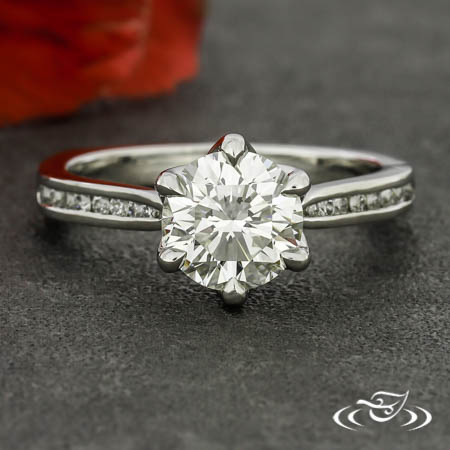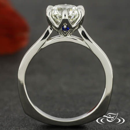 Custom 950 platinum ring holding a 6-prong set customer provided round diamond center stone with (1) GLJW provided round blue sapphire bead set in the North and South prong. There are also (16) channel set GLJW provided round lab diamonds going ~1/2 way around. This ring also has a round in/square out reverse taper shank and a high polish finish.