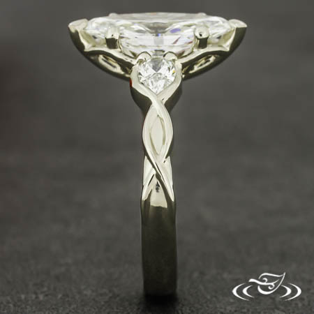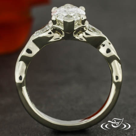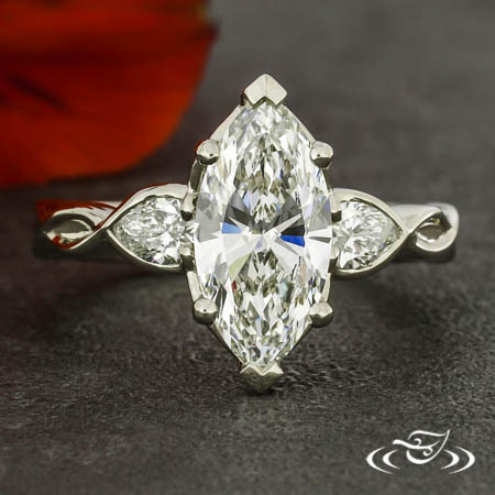 Custom 14kt white gold ring holding a 6-prong set GLJW provided marquise lab diamond center stone. This ring features organic twisted shoulders with (1) GLJW provided pear lab diamond stones half bezel set in the first twist on either shoulder. All with a round reverse taper shank and a high polish finish.