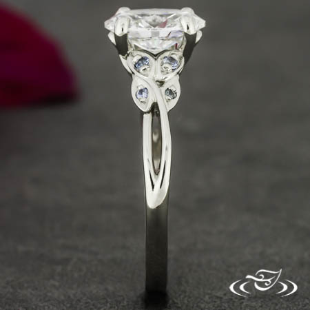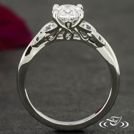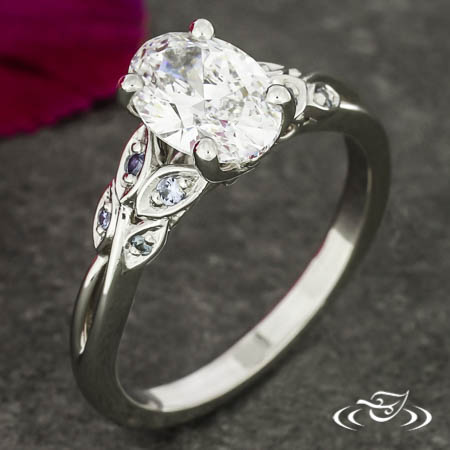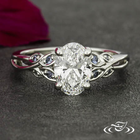Custom 950 platinum vine inspired ring holding a 4-prong set GLJW provided oval lab diamond center stone flanked by (4) round Yogo sapphires bead set in either shoulder of the organic leaf and vine inspired shank. All with a high polish finish.