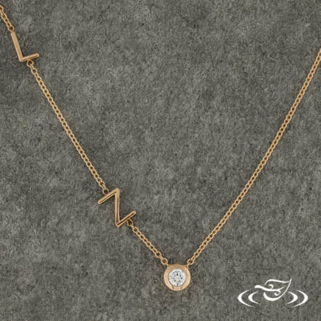 Custom assembled 14k rose gold necklace comprised of an 18" long and 1.1mm wide cable chain. (1) L initial charm and (1) Z initial charm are soldered in place within the chain. Also soldered within the chain is (1) bezel set round cut diamond. This necklace is completed in a high polish.