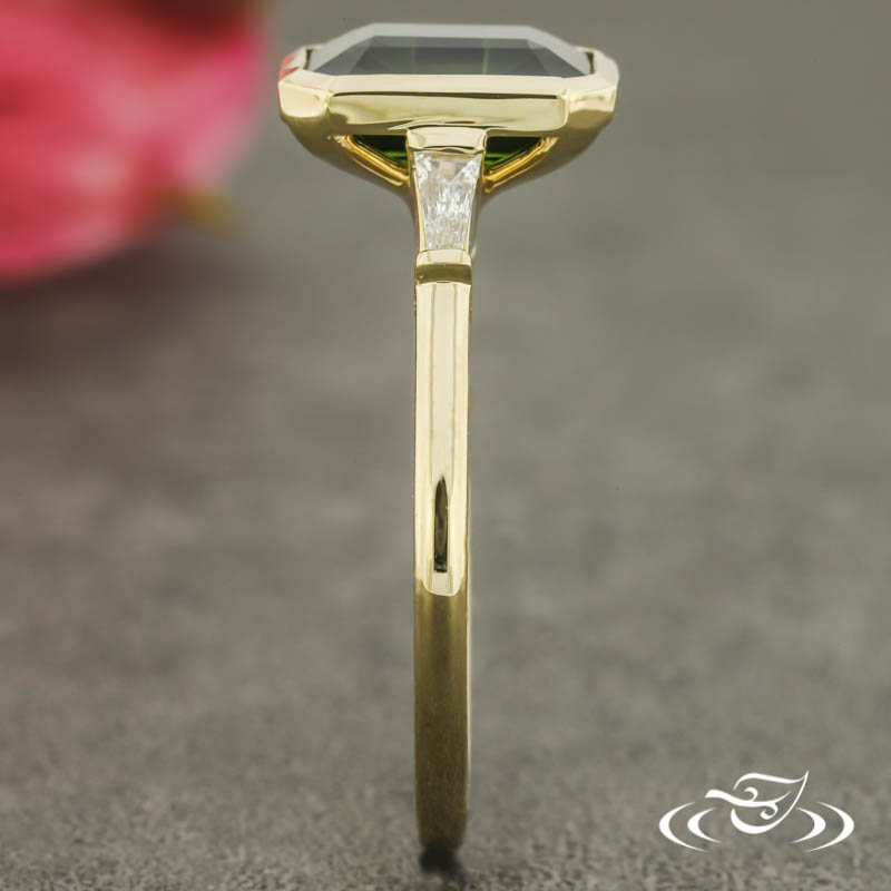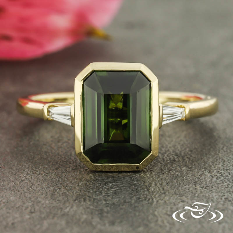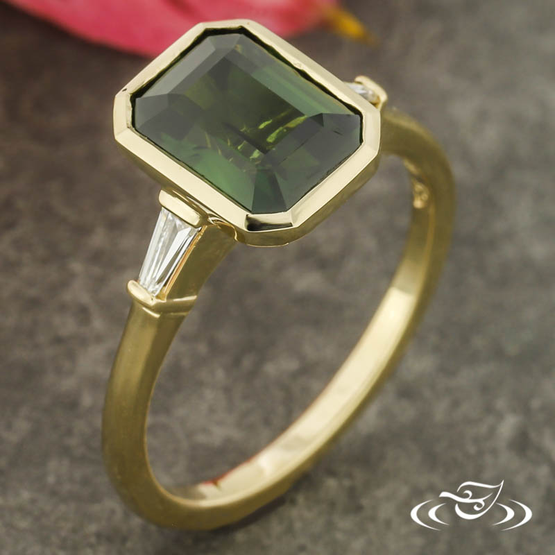 Custom 14kt yellow gold ring holding (1) client provided emerald cut dark green sapphire center stone bezel set with thin walls and a wide bright cut along the interior edge. The center setting is flanked by (2) bar set GLJW provided tapered baguette cut lab diamond side stones. This ring has a round shank, slightly domed profile, and a high polish finish.