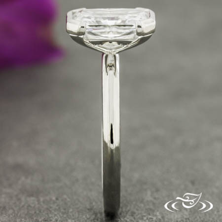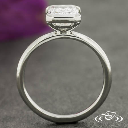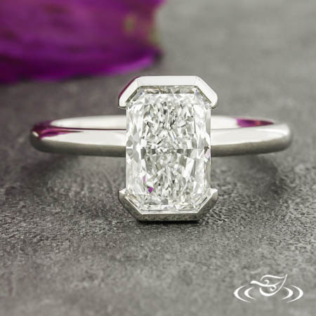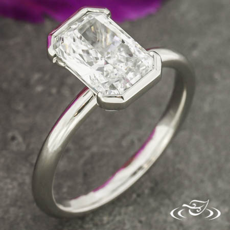 Custom 950 platinum solitaire ring holding a half bezel set GLJW provided radiant lab diamond center stone. This ring also has a round shank and a high polish finish.