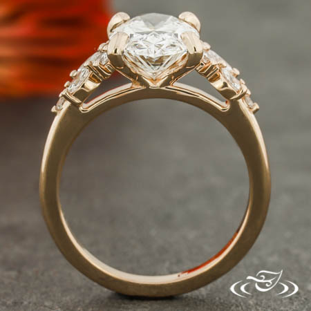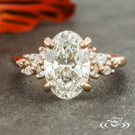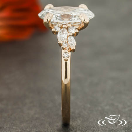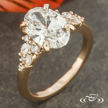 Custom 14kt rose gold ring holding (1) 4-prong set GLJW provided oval lab diamond center stone with clusters of GLJW provided round and marquise lab diamond melee shared-prong set on shoulders. This ring also has a round shank, slightly domed profile, and a high polish finish.