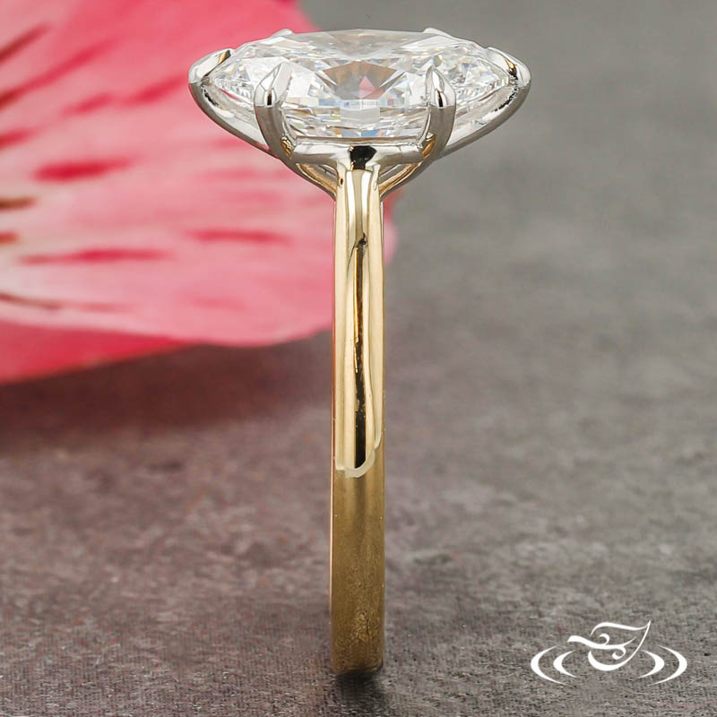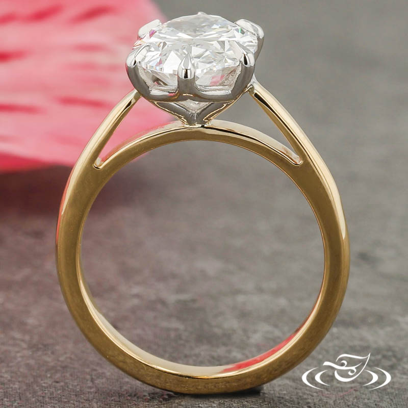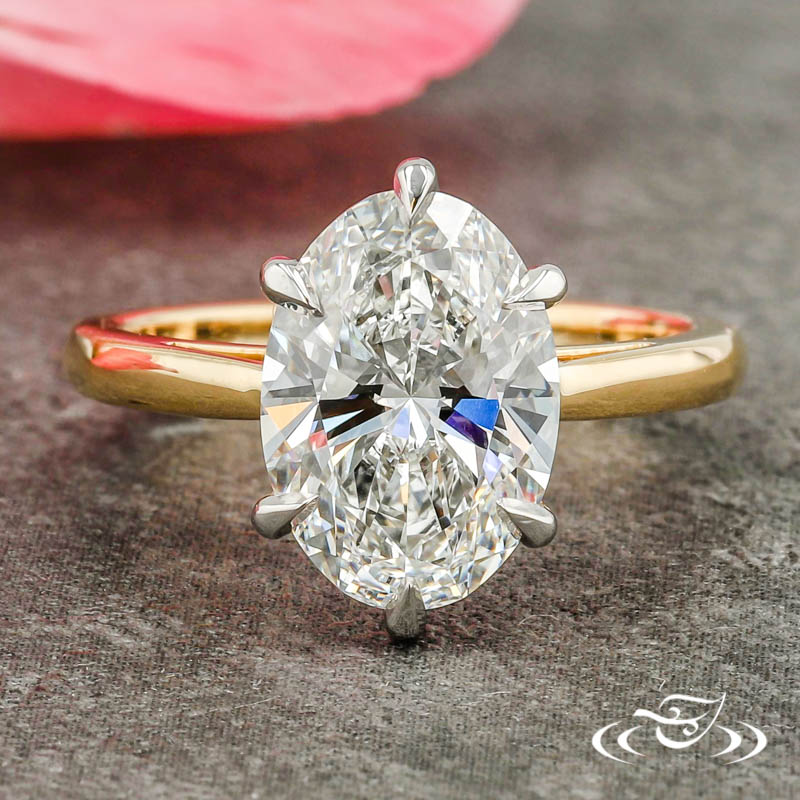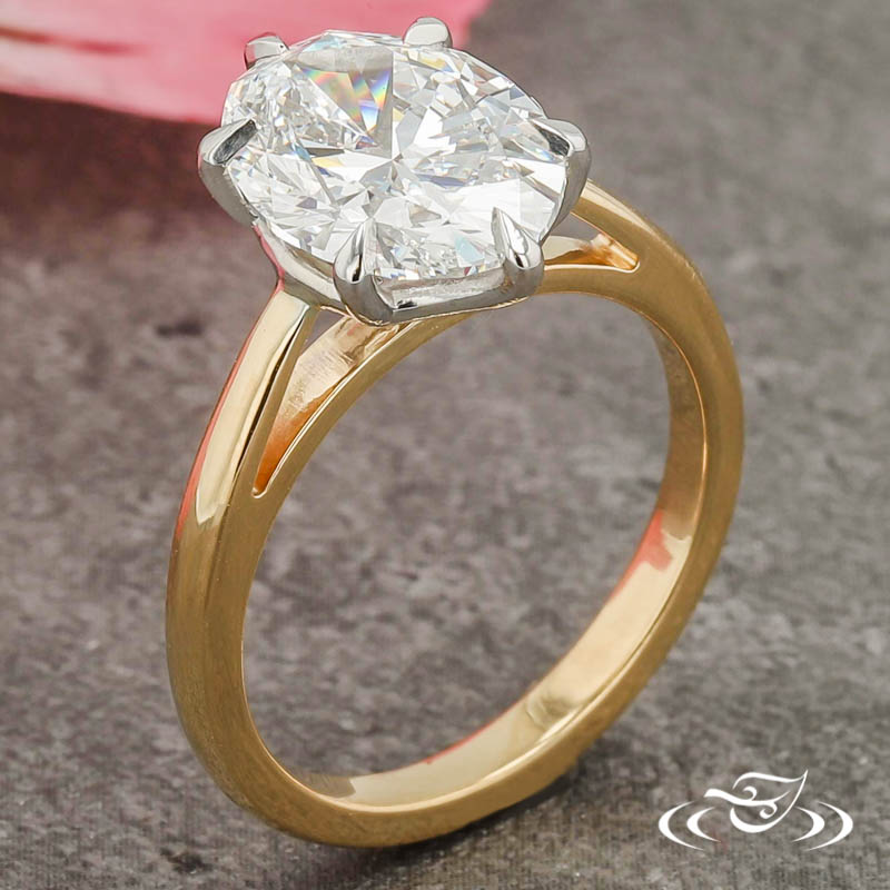 Custom 2-tone solitaire ring with a 950 platinum center setting holding (1) GLJW provided oval cut lab diamond center stone 6-prong set with delicate pointed prongs. The remainder of the ring is comprised of an 18k yellow gold round domed shank with a reverse taper. All with a high polish finish.
