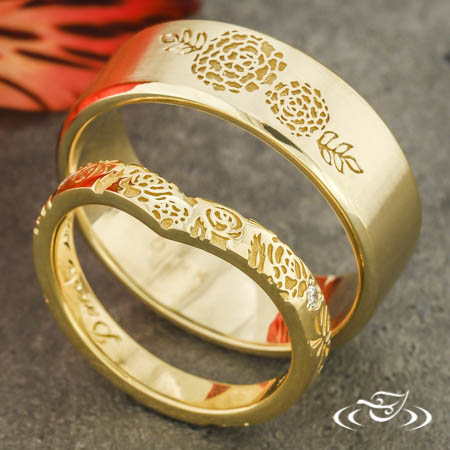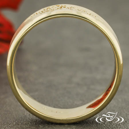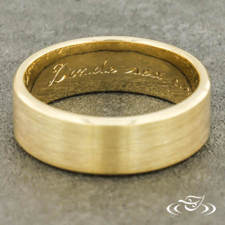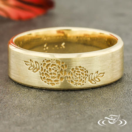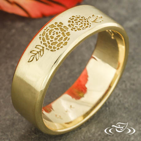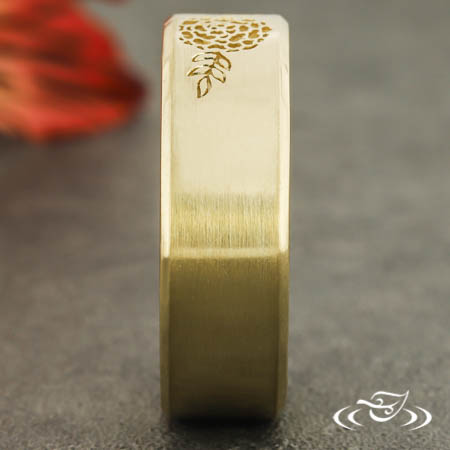 Custom 14kt yellow gold band with a flat comfort fit profile and beveled edges. Sitting at the top of the band is a recessed magnolia blossom and leaf design. This band has a high polish finish on the edges, satin finish on the flat top face, and a stippled finish in the recessed areas.
