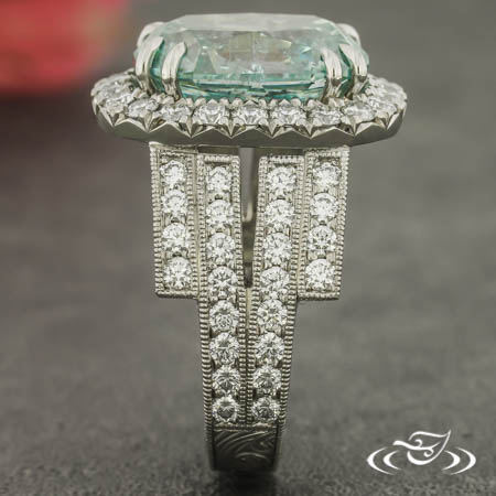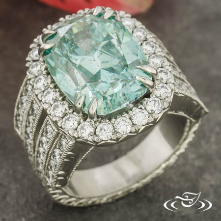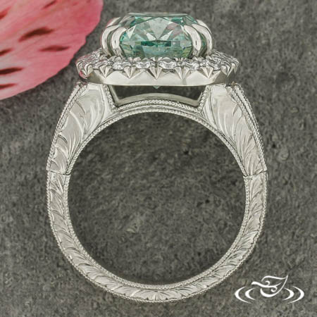 Custom 950 platinum ring featuring client provided cushion blue diamond 4-prong set on top face with double prongs surrounded by halo of GLJW provided round diamond melee french set. Split shoulders feature (4) rows of bead set GLJW provided round diamond melee. Top face of round shank features hand engraved scroll motifs, side faces feature half-wheat, all with fine milgrain detailing. High polish finish.