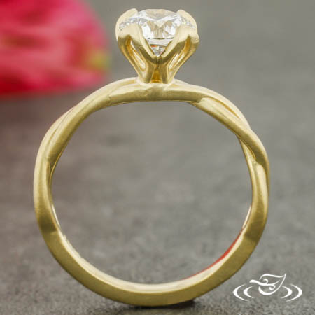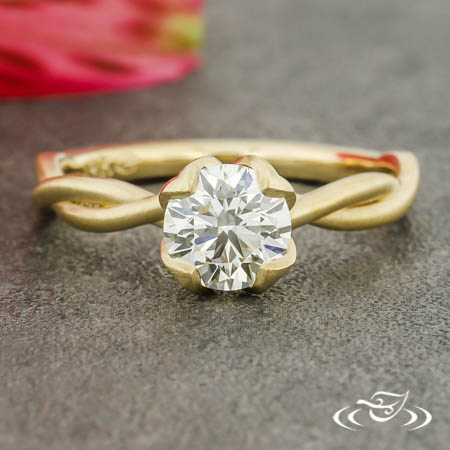 Custom 14kt yellow gold solitaire ring holding (1) GLJW provided round cut lab diamond center stone 4-prong set within a pierced petal-inspired basket. This ring has a round shank with the top two-third comprised of double twisting strands. All with a satin matte finish.