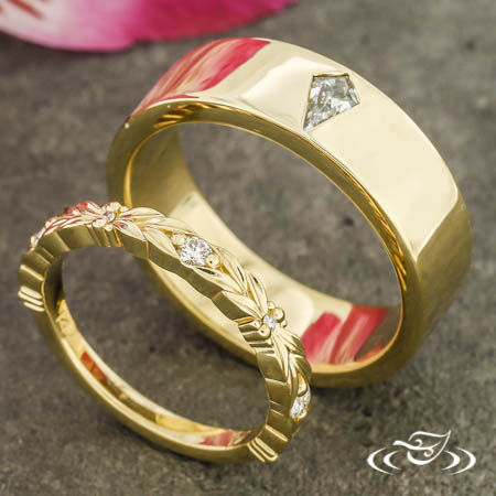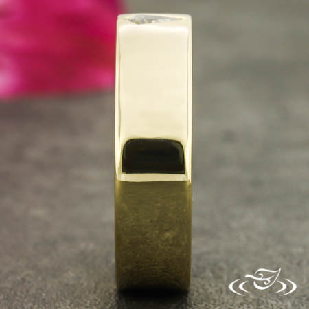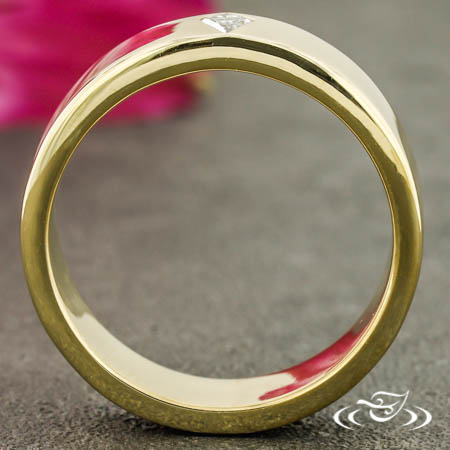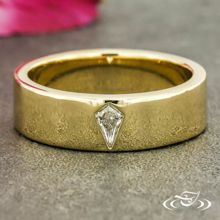 Custom 14kt yellow gold band with round shank, flat profile, and high polish finish featuring flush set GLJW provided kite shape diamond at top center.