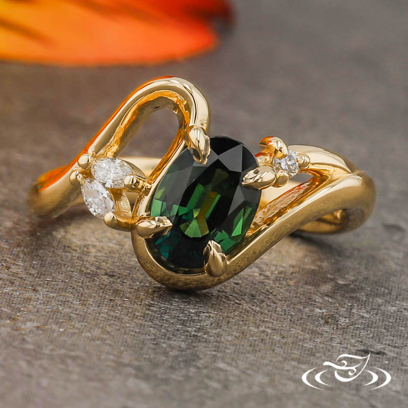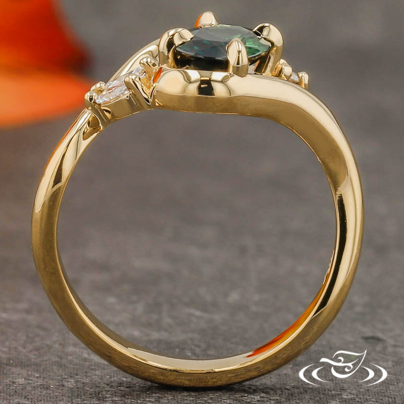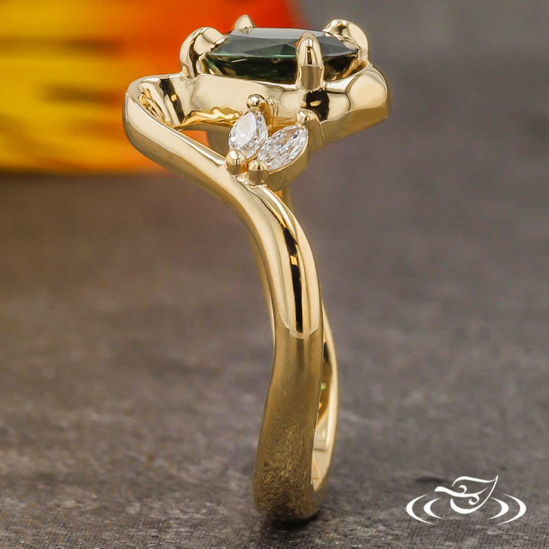 Custom 18kt yellow gold ring holding a 4-prong set GLJW provided oval sapphire center stone. There are (2) marquise lab diamonds on one side of the center & (1) round lab diamond on the other side. This ring has a freeform curvy shank and a high polish finish.