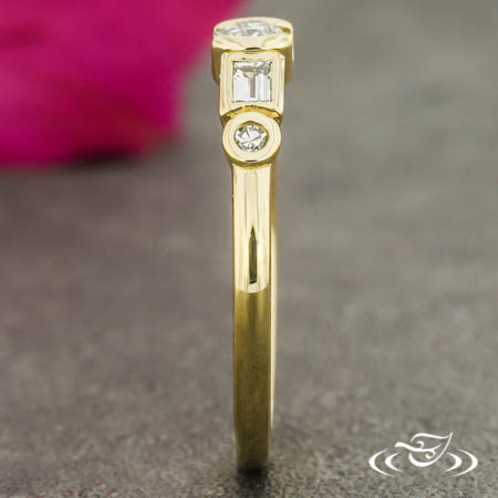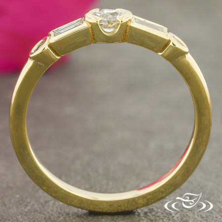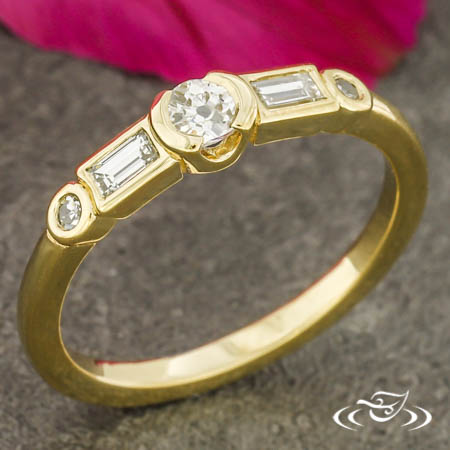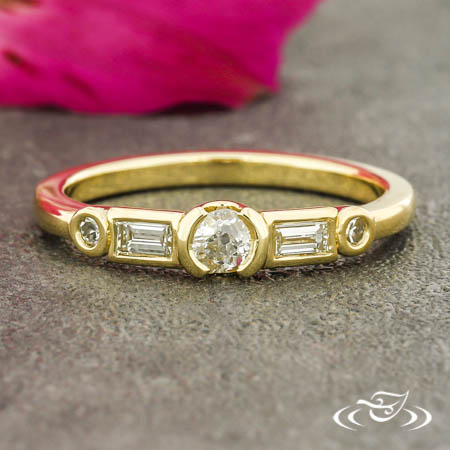 Custom 18kt yellow gold ring holding (1) half bezel set customer provided irregular mine cut diamond center stone. Flanking the center setting are (2) bezel set customer provided baguette cut diamond inner side stones and (2) bezel set customer provided round cut diamond outer side stones. This ring has a round domed shank and a high polish finish.
