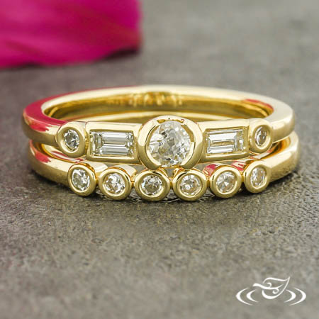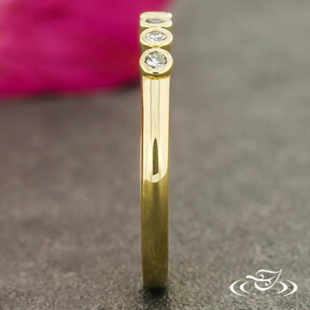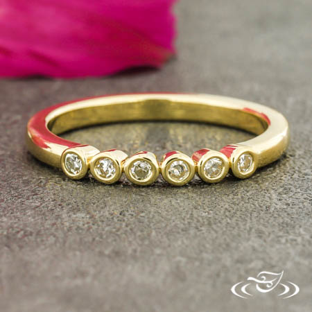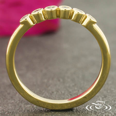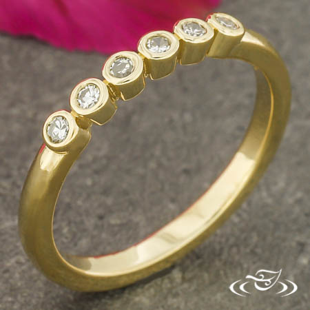 Custom 18kt yellow gold ring holding (6) customer provided round cut diamond melee individually bezel set in a row along the top ~third. The remainder of the ring has a round domed shank. All with a high polish finish.