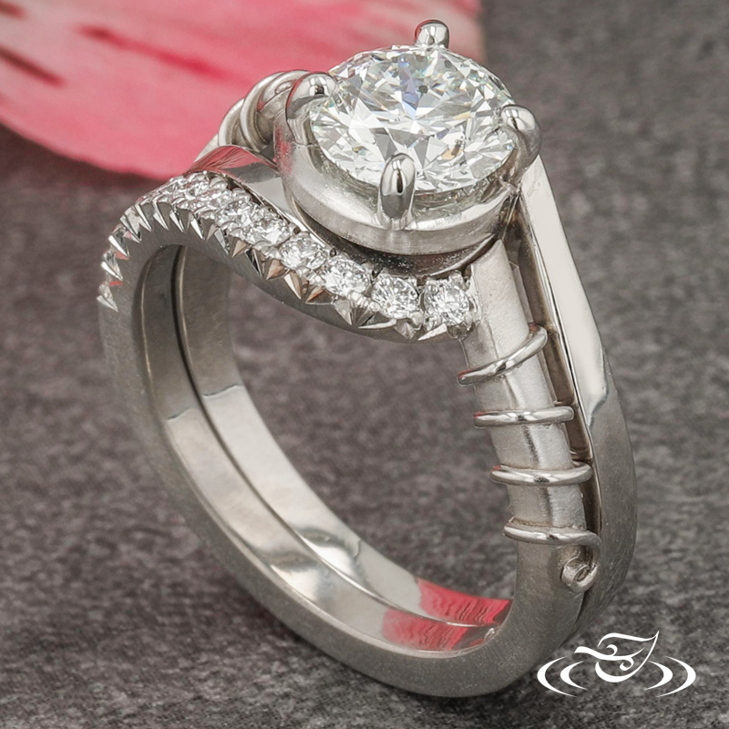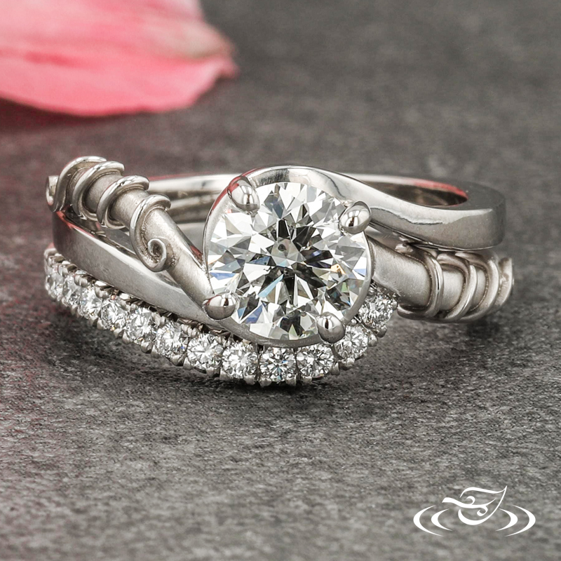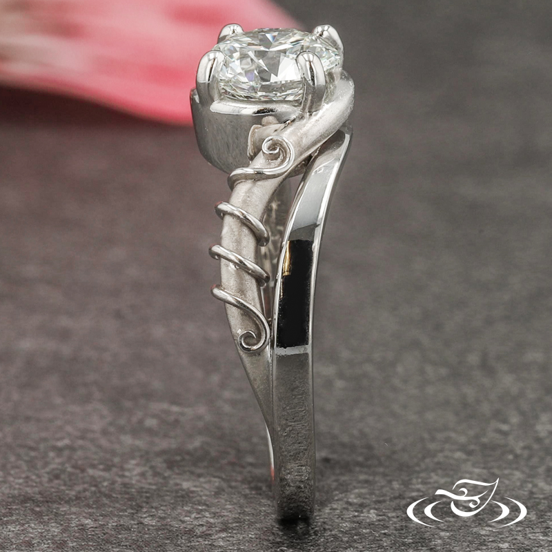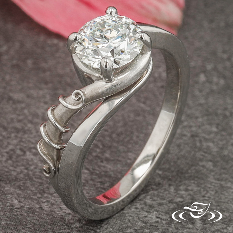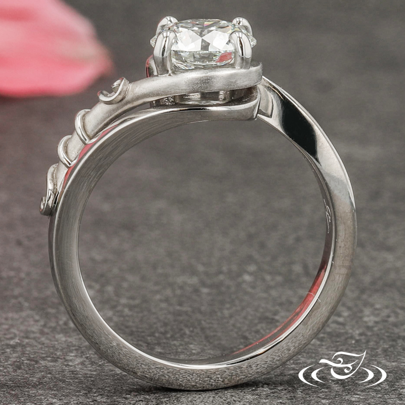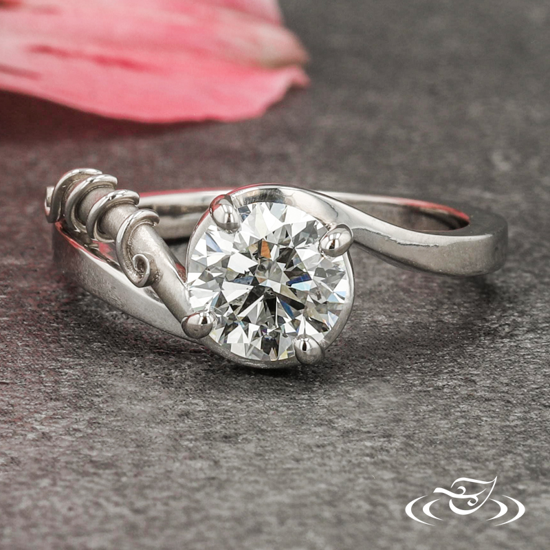 Custom 950 platinum engagement ring featuring (1) 4-prong set client provided round brilliant diamond on top face in bypass style setting. This ring also has a round shank with slightly domed profile and high polish finish with (1) matte finish pierced curl featuring high polish finish filigree wrapped around it.