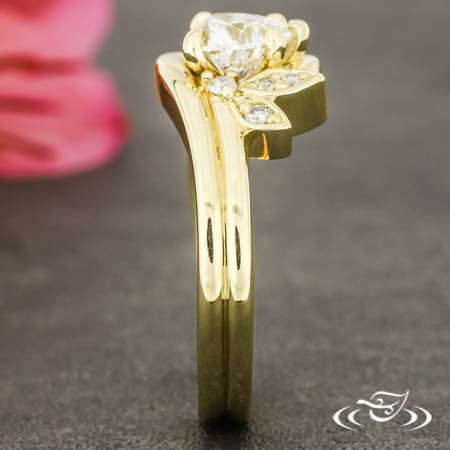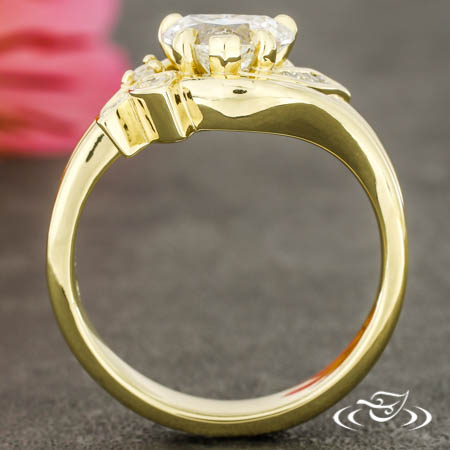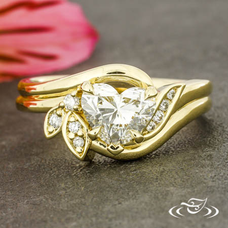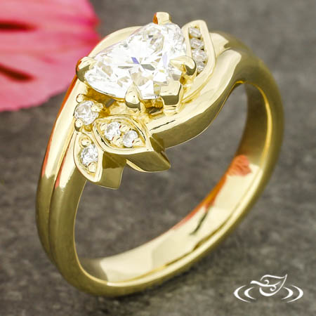 Custom 14kt yellow gold bypass style ring holding a GLJW provided heart lab diamond center stone. There are also (2) leaves holding (3) bead set customer provided round diamonds, (1) prong set customer provided accent diamond, and (4) channel set customer provided diamonds. This ring also has a round shank and a high polish finish.