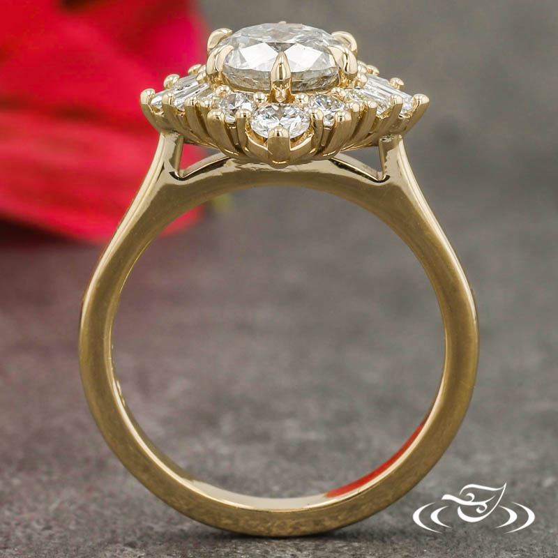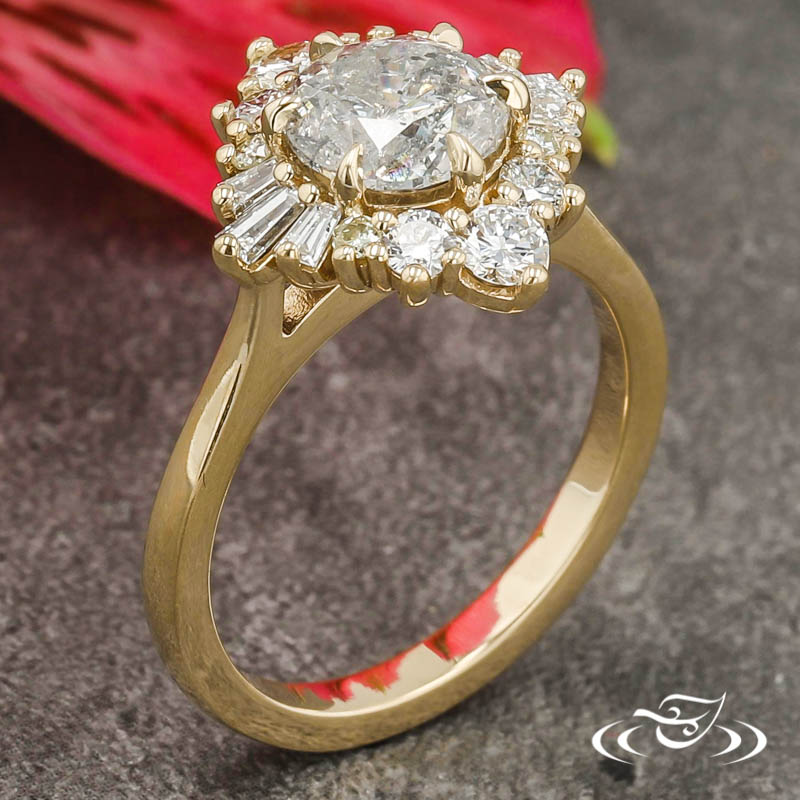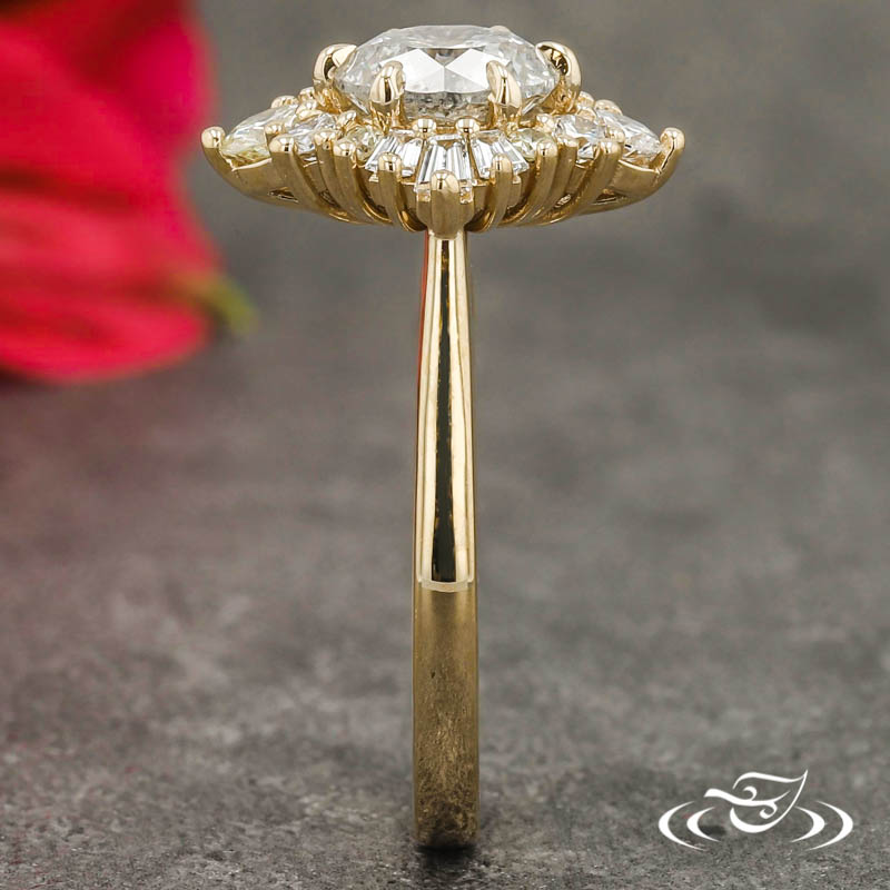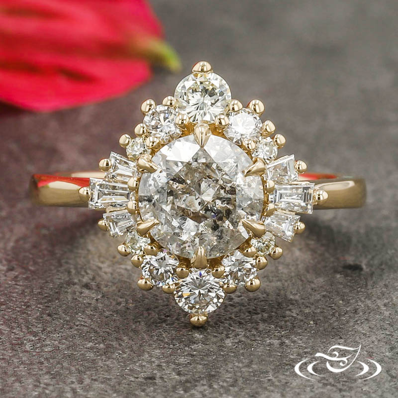 Custom 14kt yellow gold ring holding (1) GLJW provided round cut rustic salt & pepper diamond center stone 6-prong set with delicate pointed prongs. A ballerina style halo frames the center stone. The halo is formed by a round cut diamond prong set at the north and south points and (3) prong set tapered baguette cut diamonds prong set at the east and west points. Between the points each sit (2) additional prong set round cut diamond melee, together forming a kite-like shape. The remainder of the ring has a reversely tapered round domed shank. All with a high polish finish.