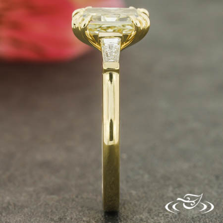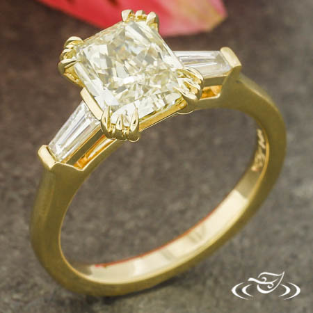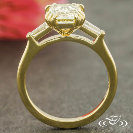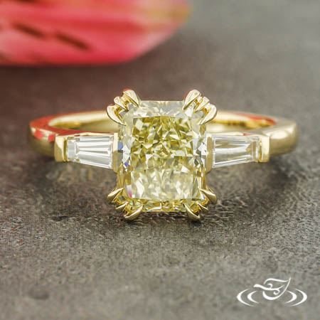 Custom 14kt yellow gold ring featuring (1) GLJW provided radiant yellow diamond 4-prong set with triple pointe4d prongs flanked by (2) GLJW provided tapered baguette diamond bar set. This ring also has a round shank, slightly domed profile, and a high polish finish.