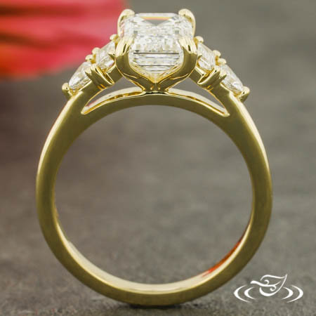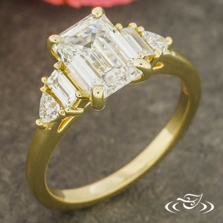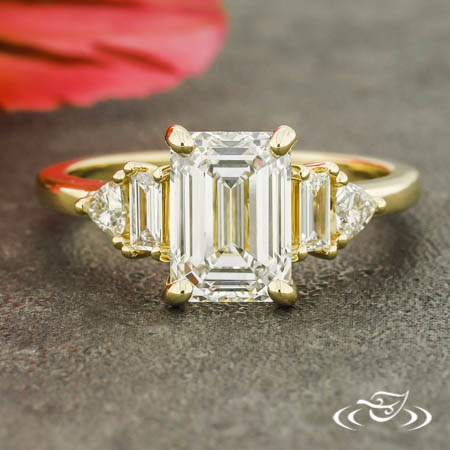 14k yellow gold ring featuring emerald cut lab diamond center with lab baguette and trillion accent stones, high polish finish.