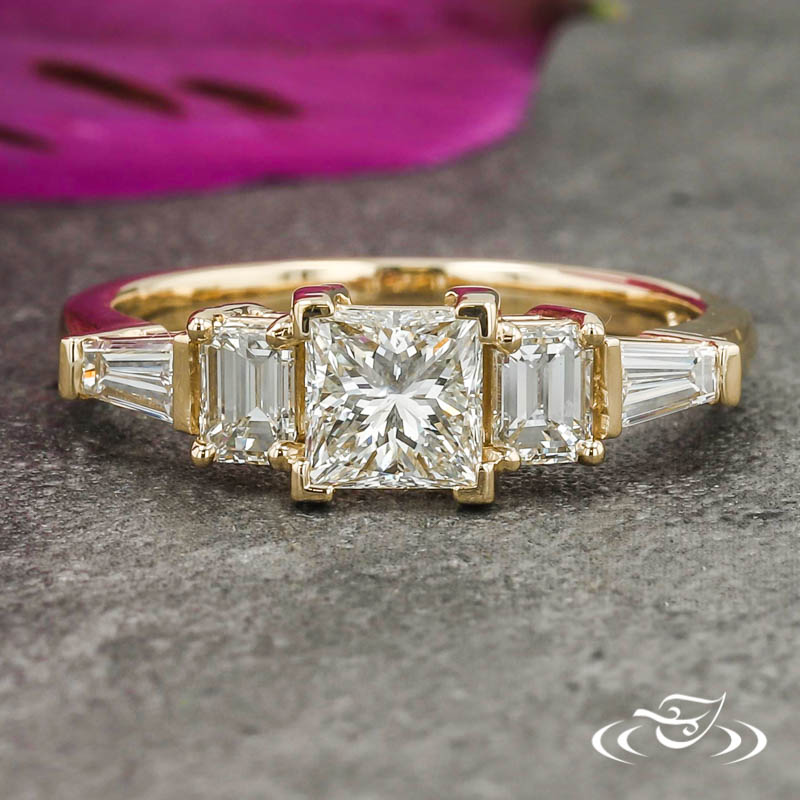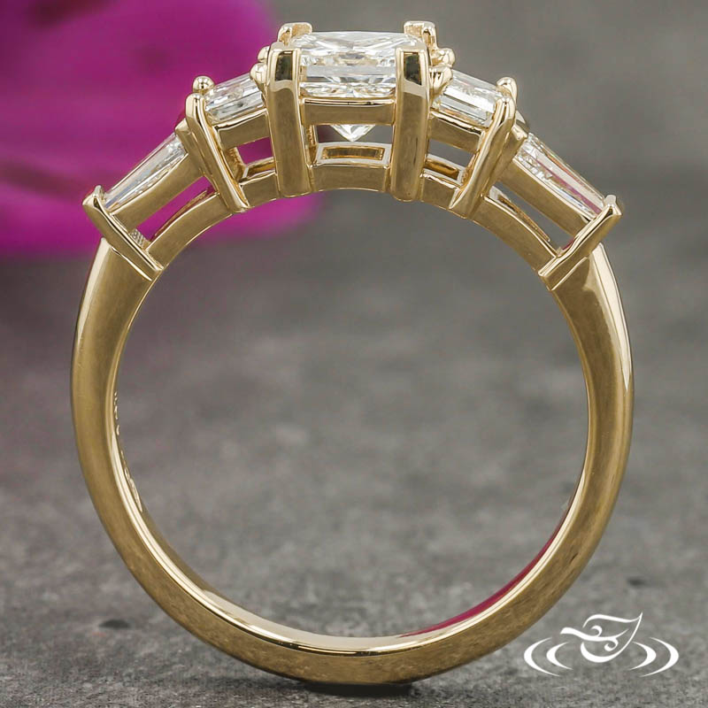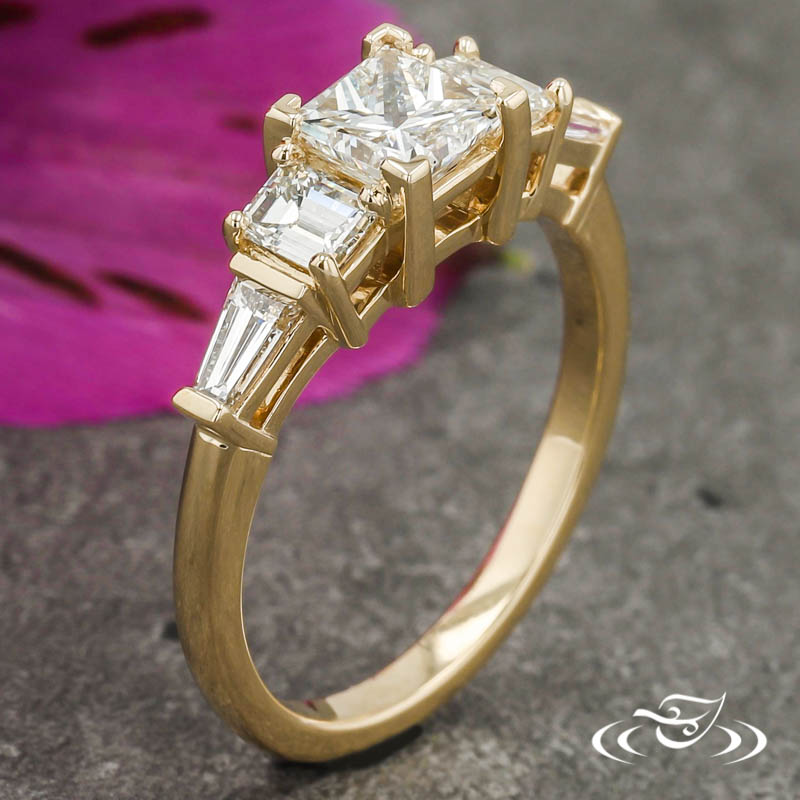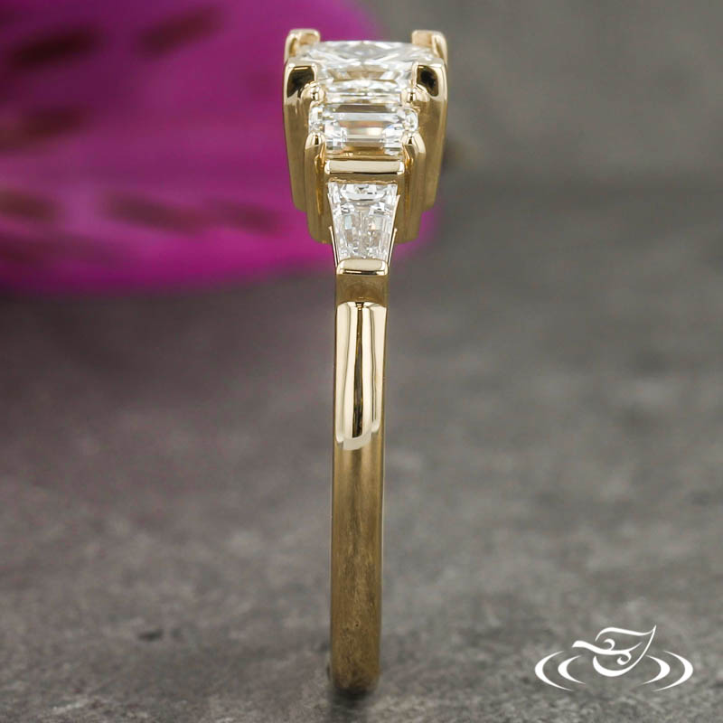 Custom 14kt yellow gold 5-stone ring holding a customer provided princess diamond center stone. (2) GLJW provided emerald cut diamond stones on top face. (2) GLJW provided tapered baguette diamond stones on top face. This ring also has a shank and a high polish finish.