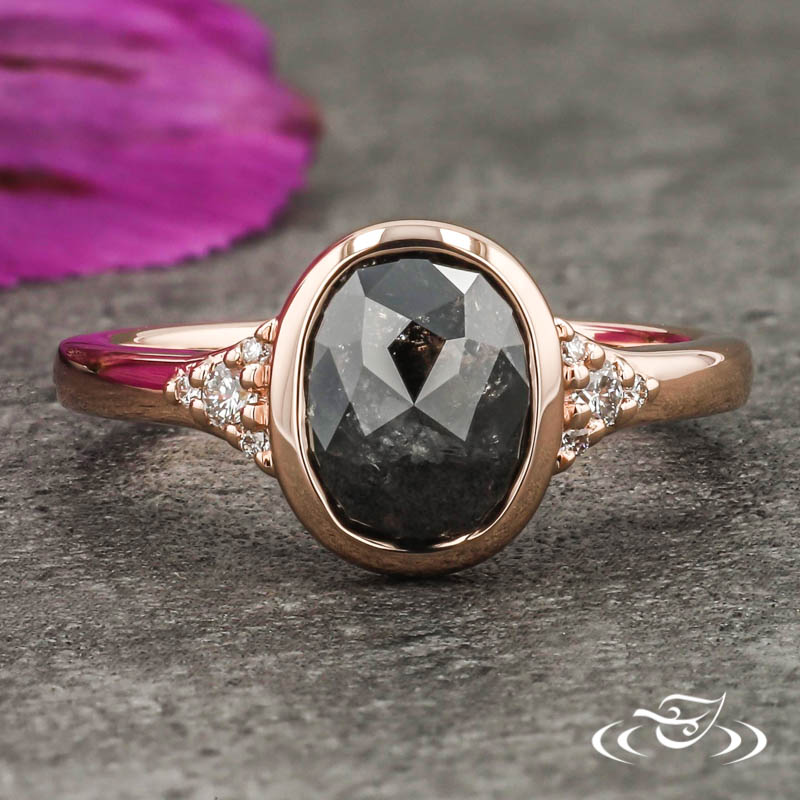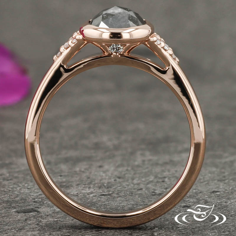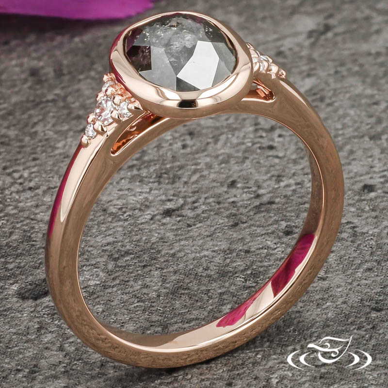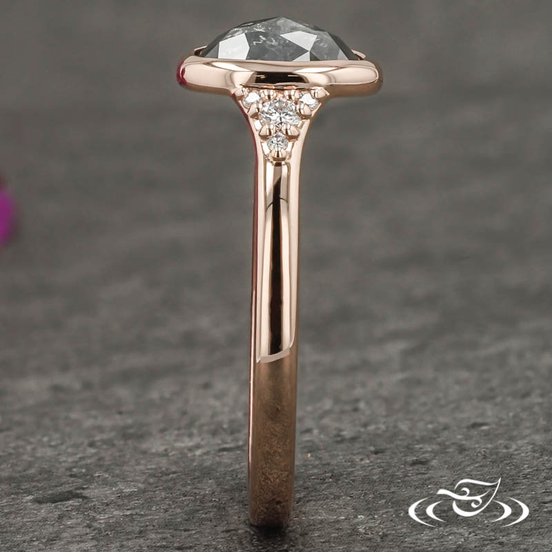 Custom 14kt rose gold cluster style ring holding a bezel set GLJW provided oval rustic rose cut salt and pepper diamond center stone with (4) GLJW provided round lab diamonds bead set on either shoulder with (1) GLJW provided round peek-a-boo lab diamond bead set in the under gallery on either side. This ring also has a round straight taper shank and a high polish finish.