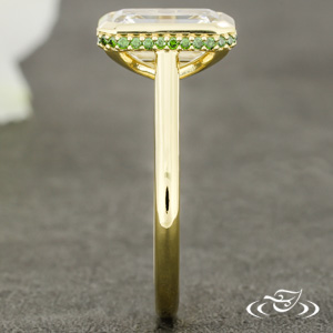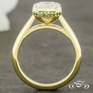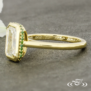 Custom 14kt yellow gold solitaire ring holding a bezel set GLJW provided emerald cut lab diamond center stone with (36) GLJW provided round forest green irradiated diamonds prong set in a hidden halo. This ring also has a round shank and a high polish finish.