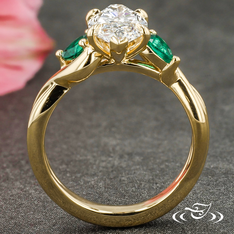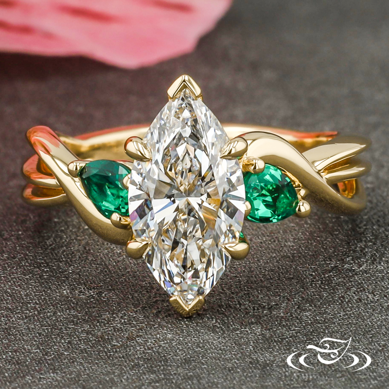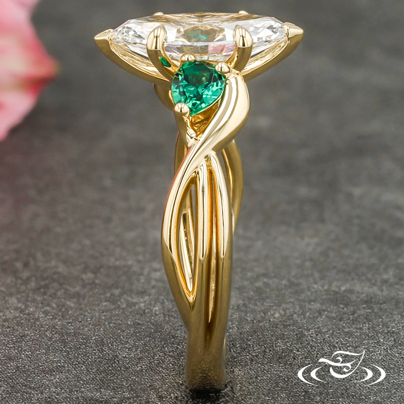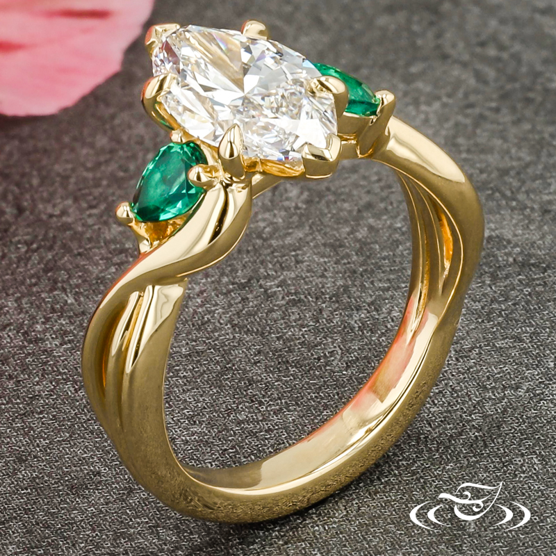 Custom 18k yellow gold ring featuring (1) client provided marquise lab diamond with chevron prongs at tips and pointed prongs at sides. Each shoulder features (1) 3-prong set pear lab emerald. Round shank features pierced twists with solid, slightly domed profile at bottom.