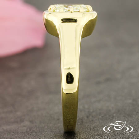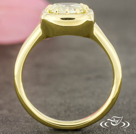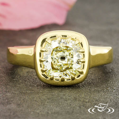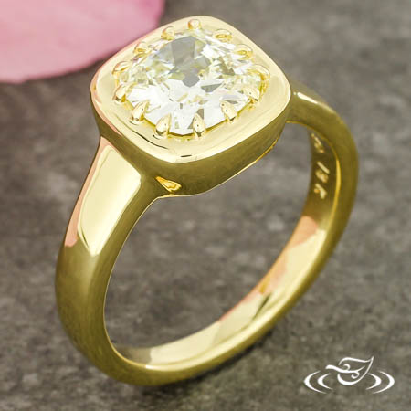 Custom 18kt yellow gold ring holding a prong set customer provided cushion diamond center stone. This ring also has a round straight taper shank and a high polish finish.