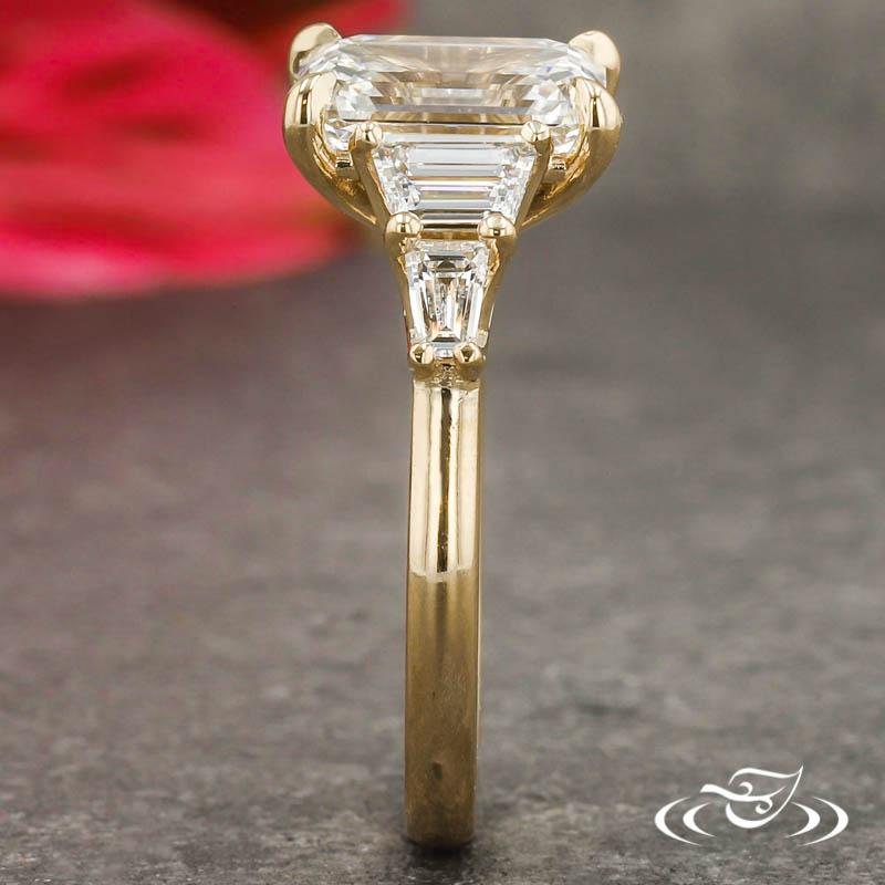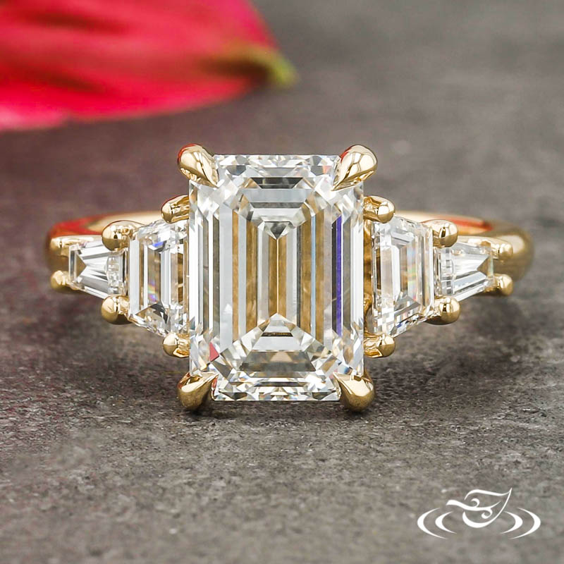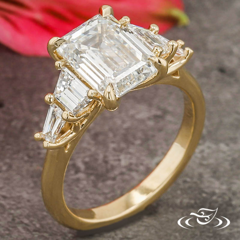 Custom 14kt yellow gold ring holding (1) GLJW provided emerald cut lab diamond center stone 4-prong set with delicate pointed prongs. Each shoulder is accented by (2) prong set GLJW provided lab diamond accent stones, (2) inner trapezoid cuts and (2) outer tapered baguette cuts. This ring has trellis style settings, a round domed shank, and a high polish finish.