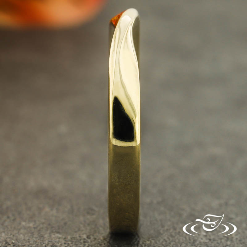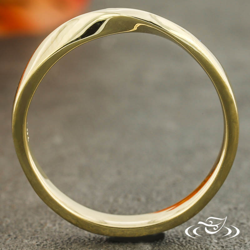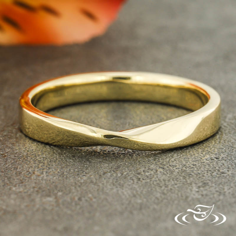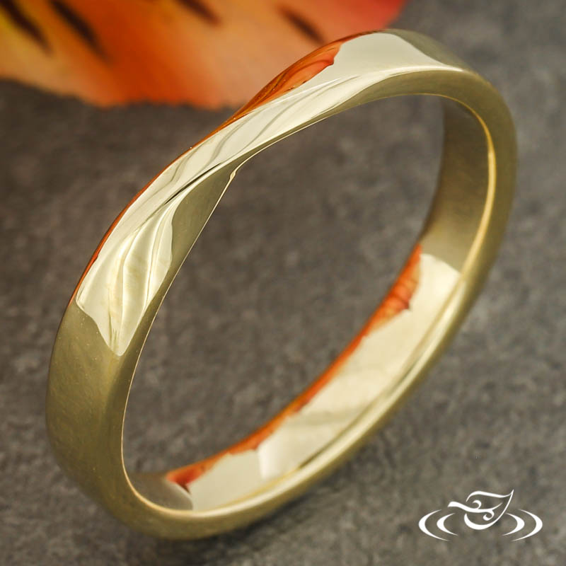 Custom 14kt yellow gold band with (1) Mobius style twist at the top. This band has a round shape and a high polish finish.