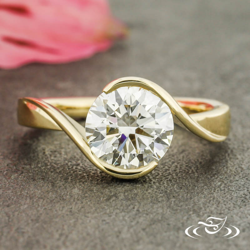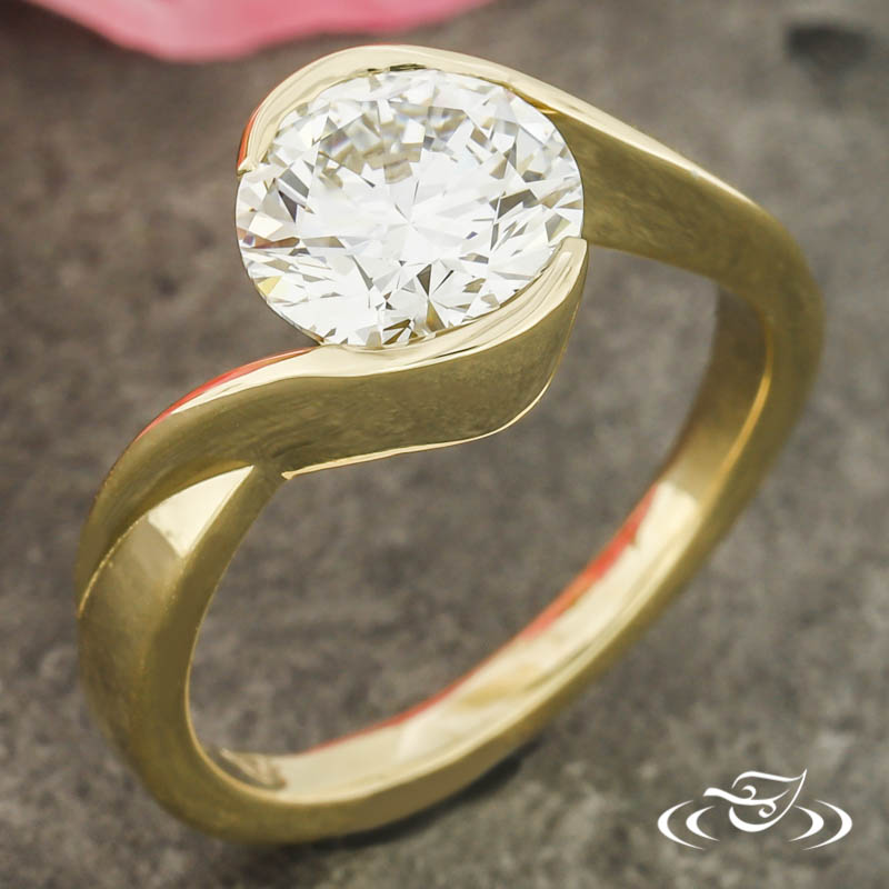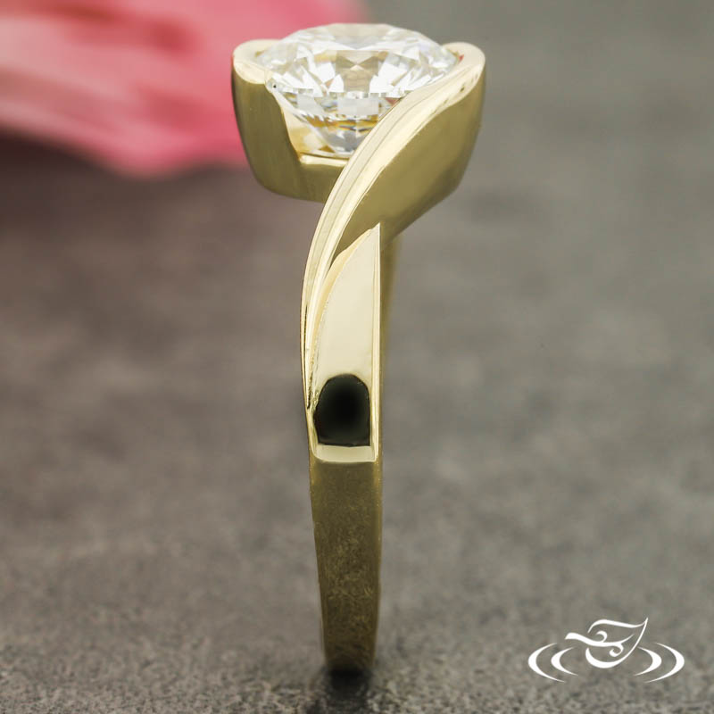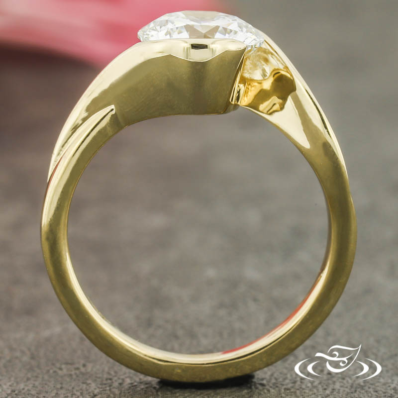 Custom 14kt yellow gold solitaire ring holding (1) wrap set client provided round cut lab diamond center stone. The raised edges of the center setting wrap once over each shoulder. The remainder of the ring has a round shank and mostly flat profile. All with a high polish finish.