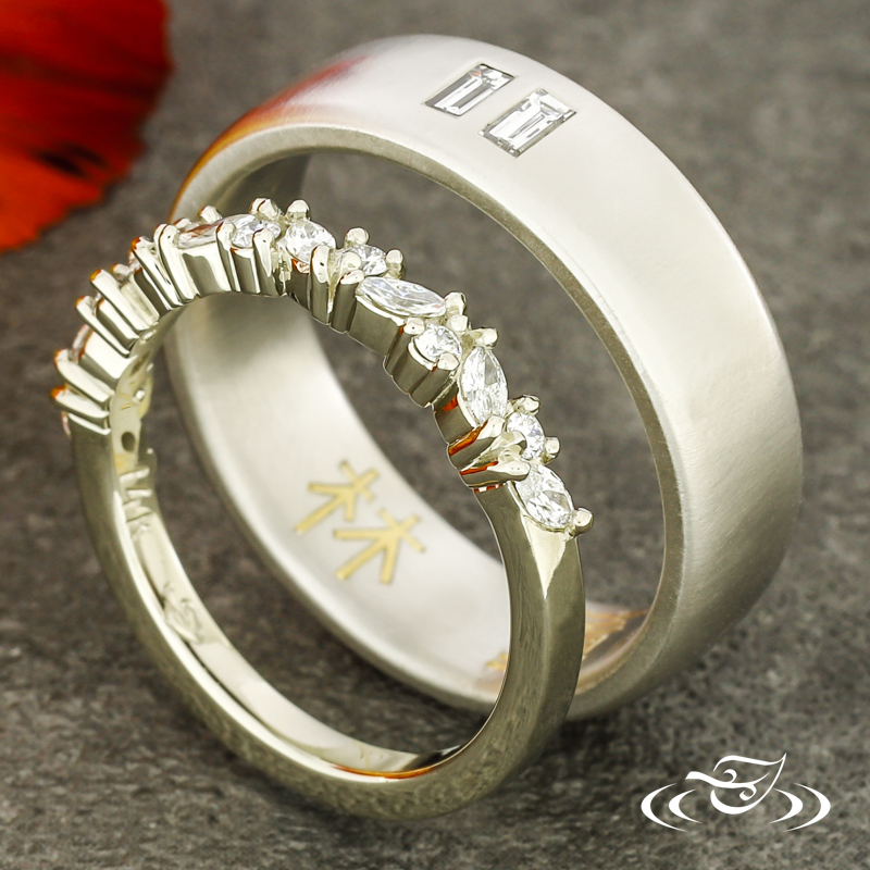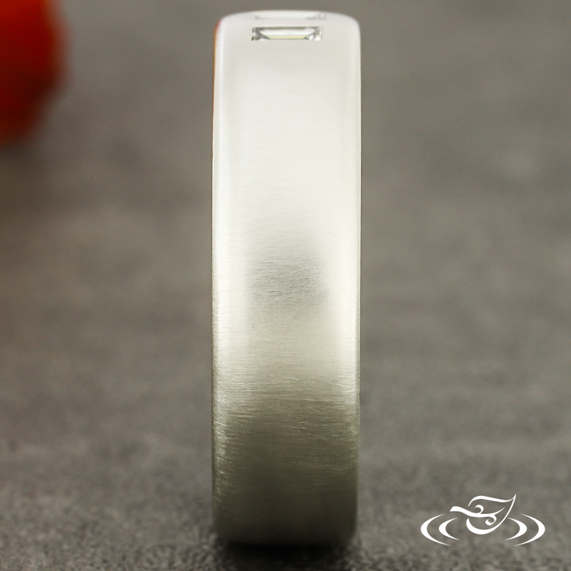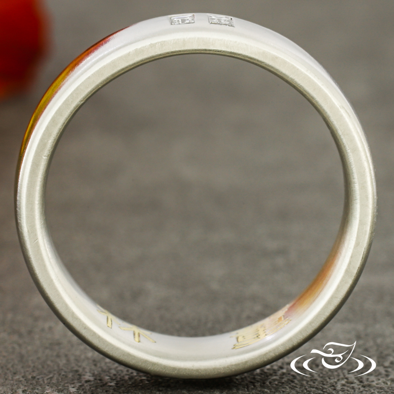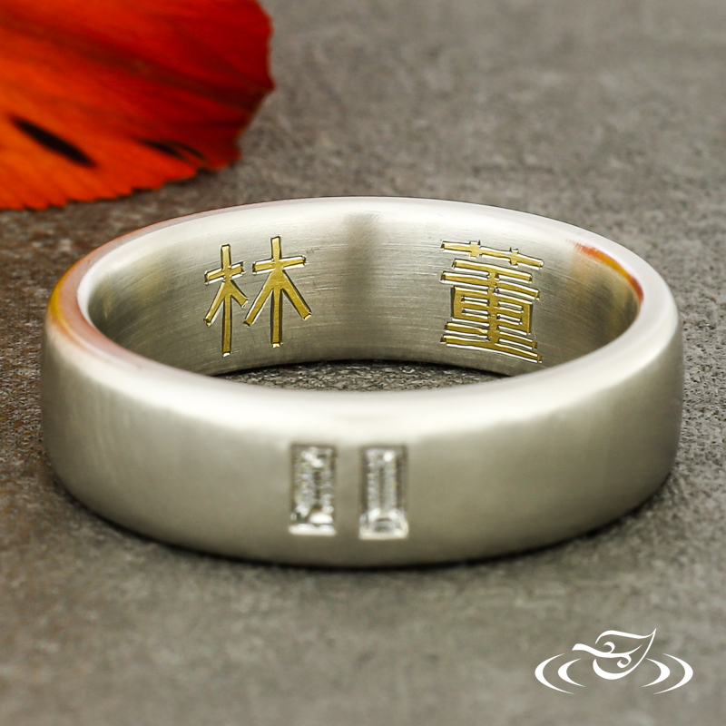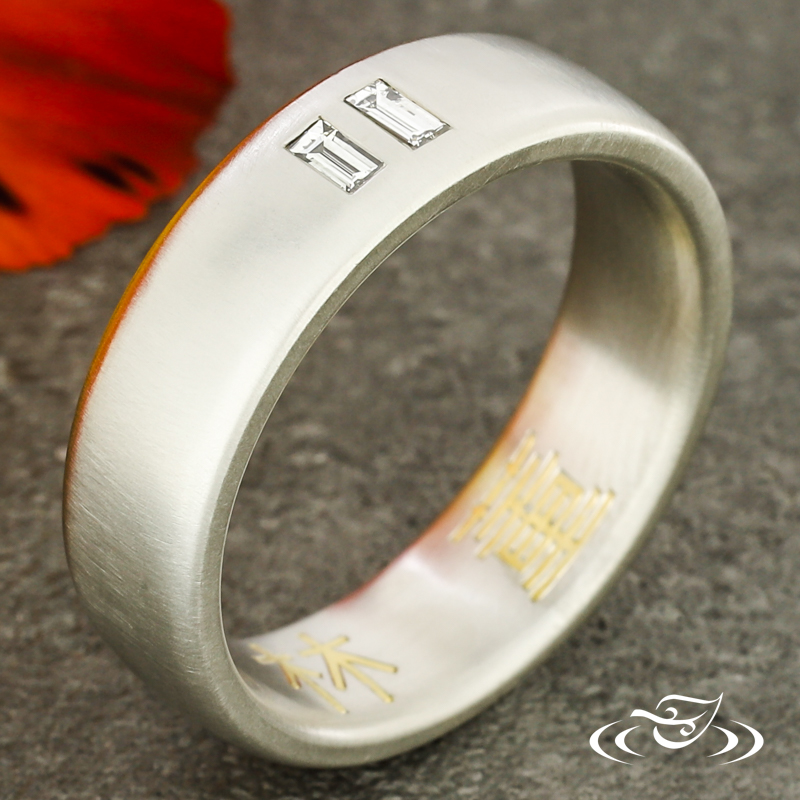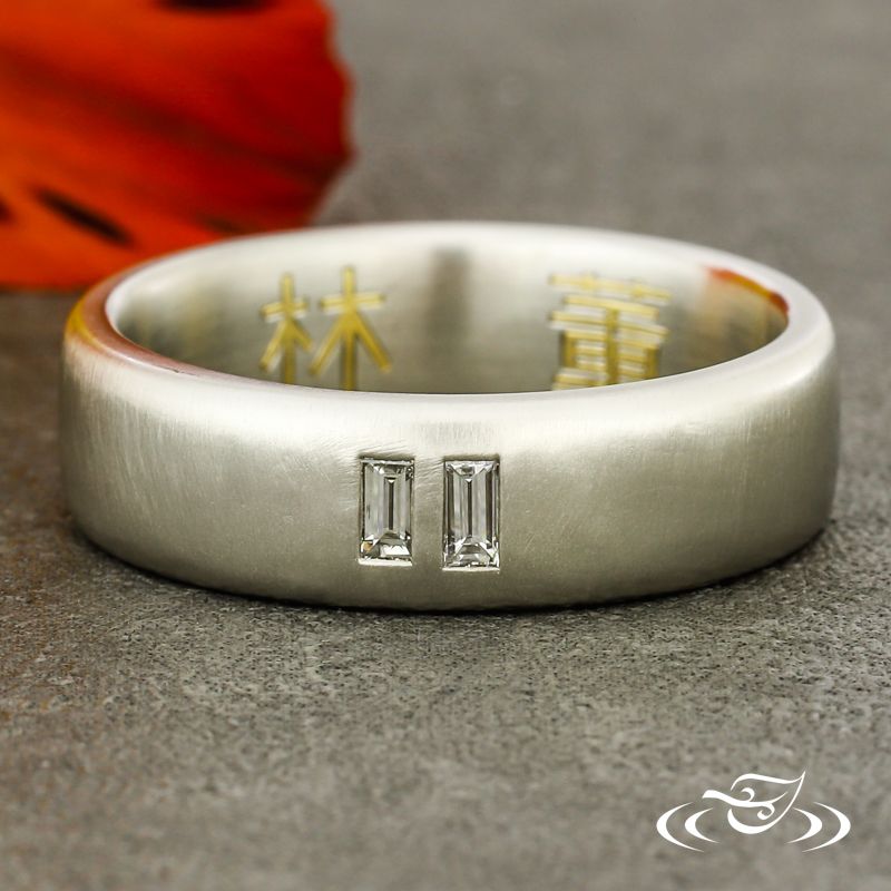 Custom 950 platinum band holding (2) flush set baguette diamonds on the top face. This band also has a round shank with hand crafted 22k yellow gold inlaid Chinese characters inside the band and a vertical matte finish.