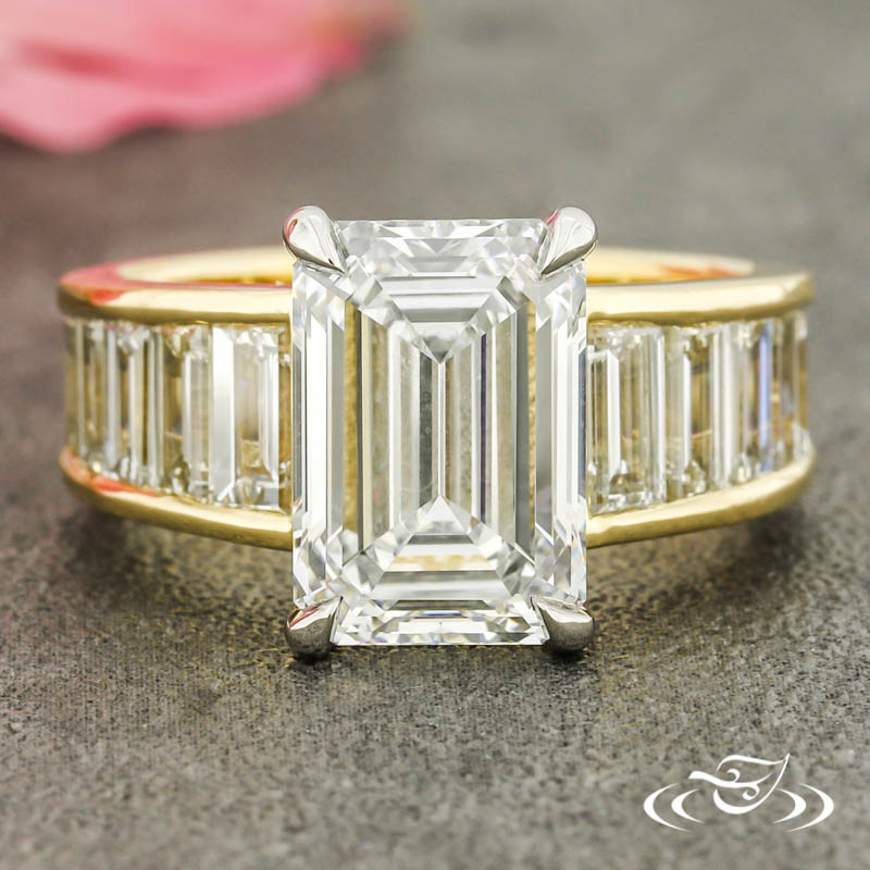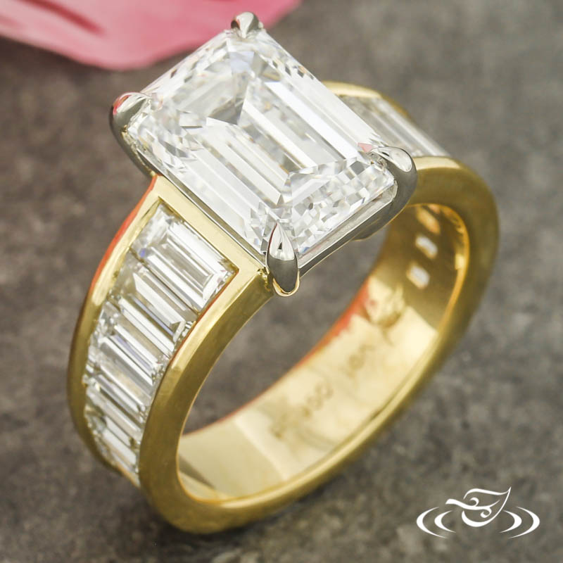 Custom two-tone ring with a 950 platinum center setting holding (1) 4-prong set GLJW provided emerald cut lab diamond center stone. The remainder of the ring consists of an 18k yellow gold round shank with a tapering flat profile. The shank has GLJW provided baguette cut lab diamond melee channel set lengthwise from edge to edge along the top ~three-quarters. All with a high polish finish.