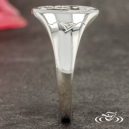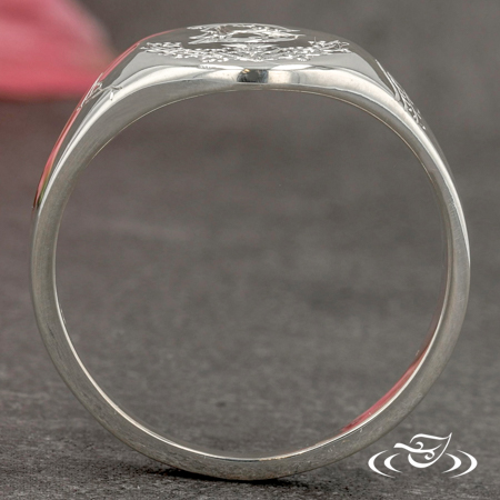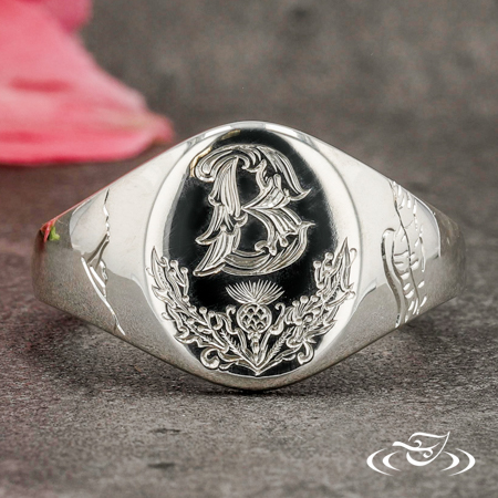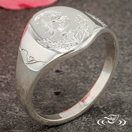 Custom sterling silver signet ring with an oval flat top face accented by a hand engraved B with floral detailing under the letter. Hand engraved mountain and wave detailing accents this shoulders. This ring has (1) small paw print engraved on the inside directly under the top face. All with a high polish finish.