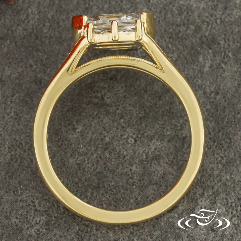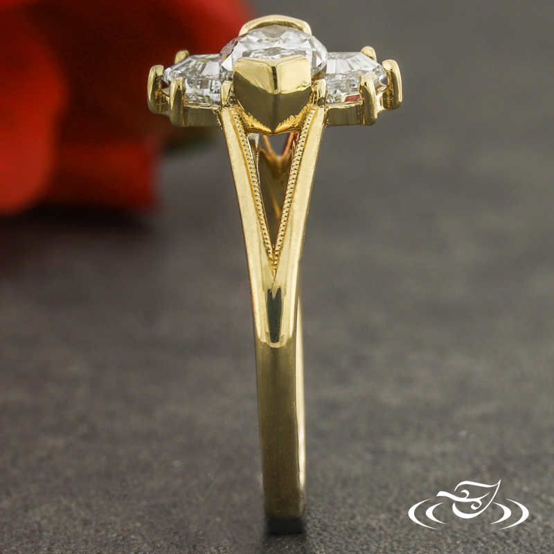 Custom 14kt yellow gold ring holding (1) customer provided marquise cut diamond center stone half bezel set lengthwise from east to west. Flanking the center stone, at the north and south ends, are (2) prong set GLJW provided cadillac cut diamond side stones. This ring has a round domed shank with split tapered shoulders. Milgrain frames the inner edge of the split shoulders and along the bridge on both side faces. All with a high polish finish.
