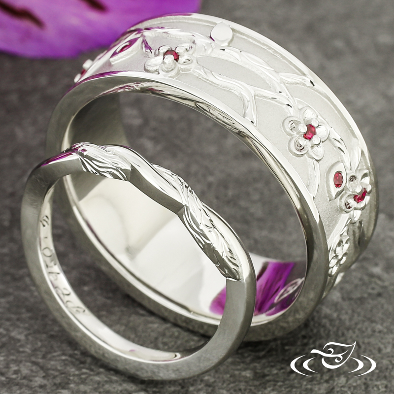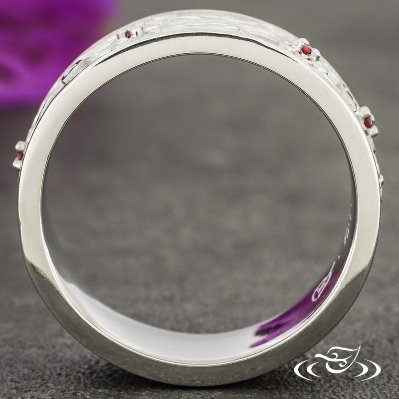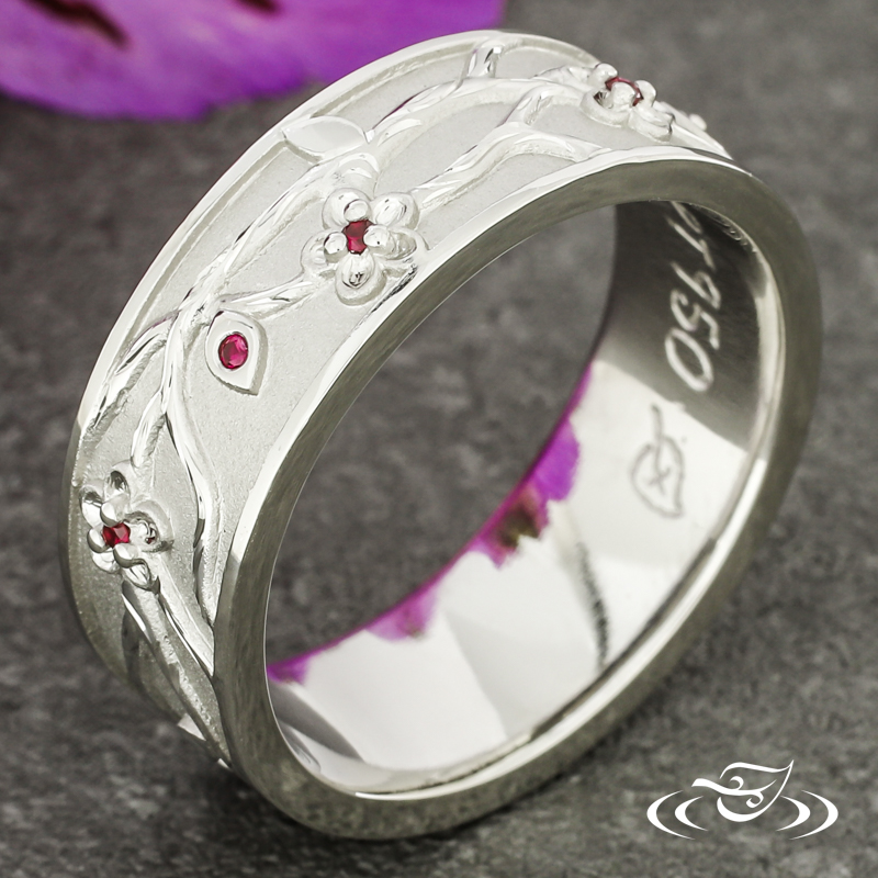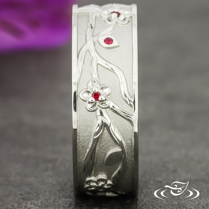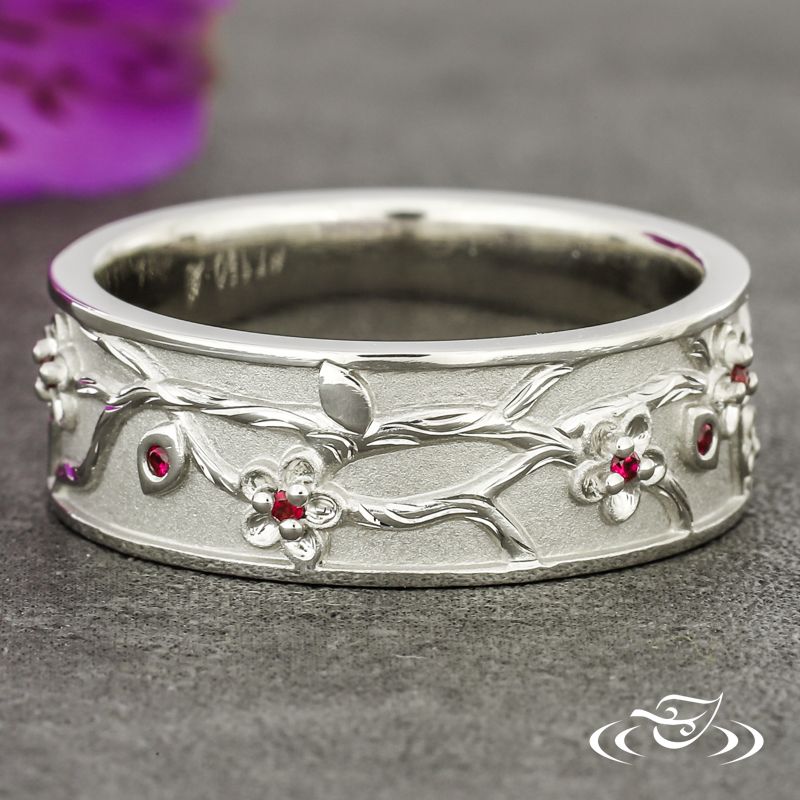 Custom 950 platinum band with a cast in place cherry blossom branch motif going all the way around holding (6) bead set GLJW provided round ruby stones. This band also has a round shank and a bead blast finish background with high polish detailing and rails.