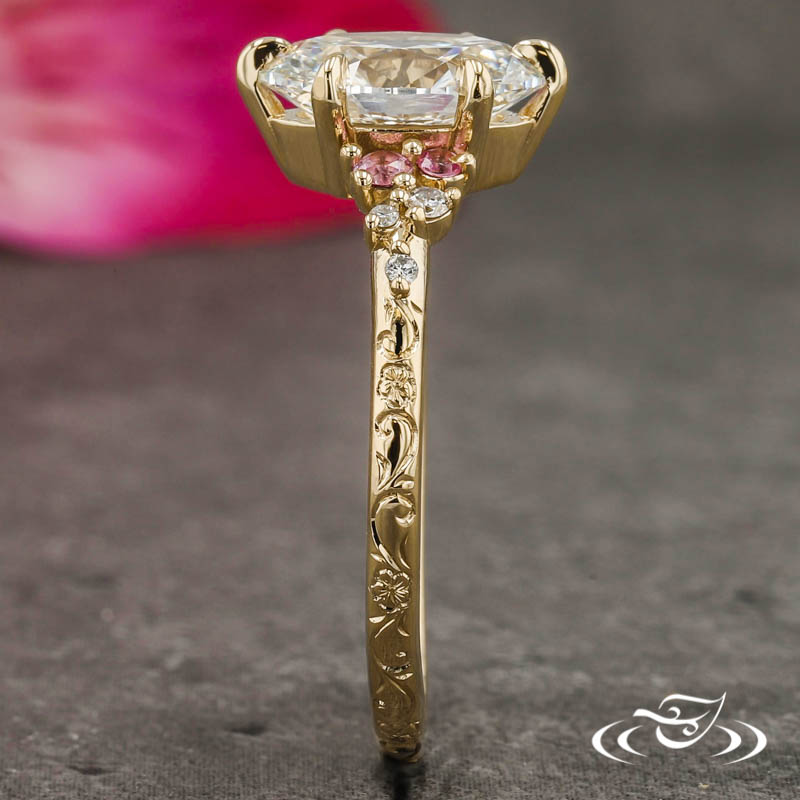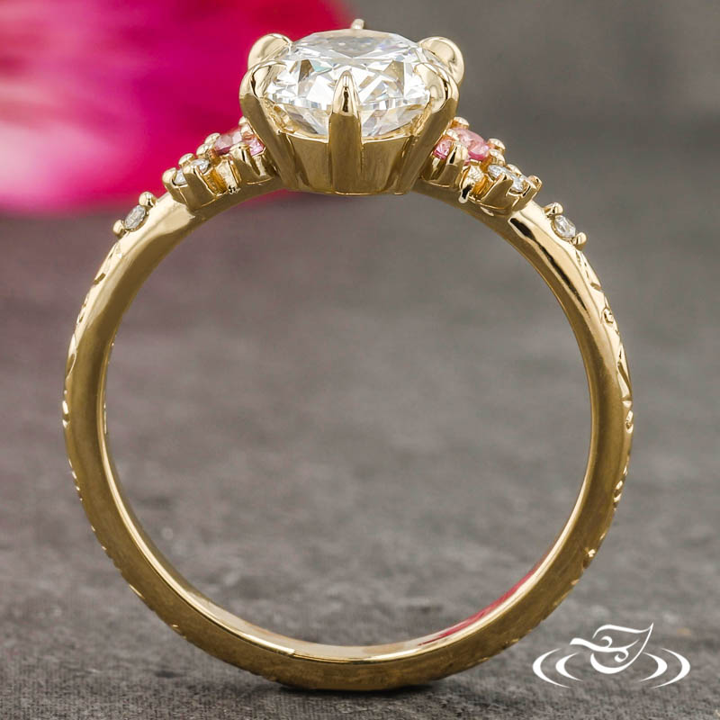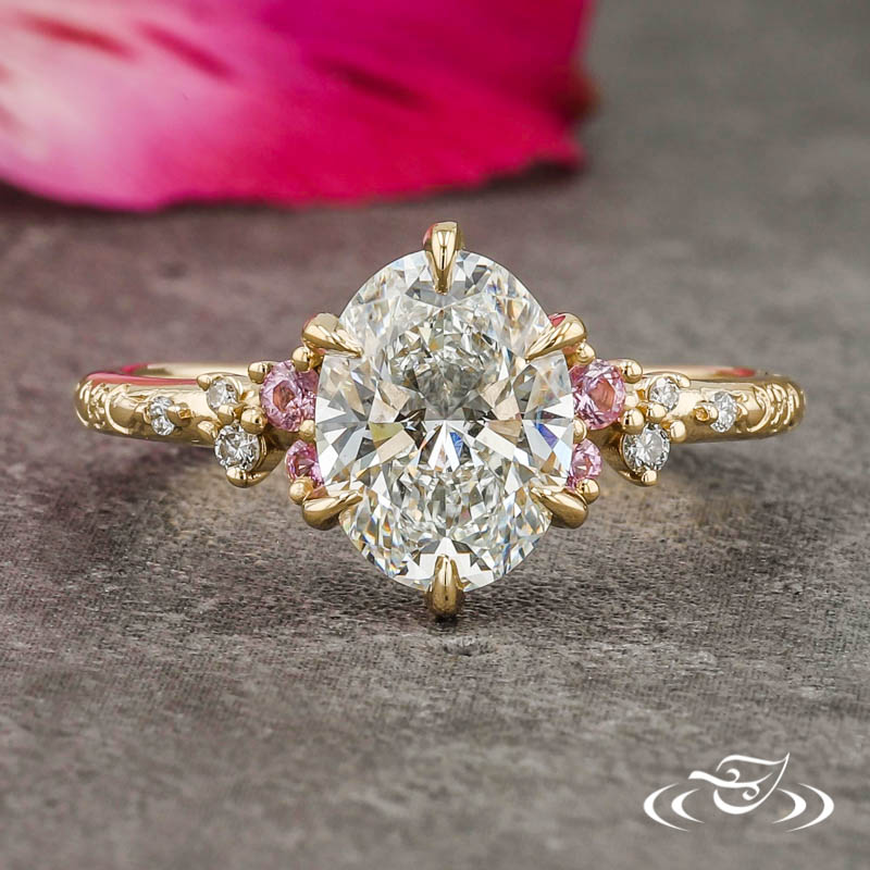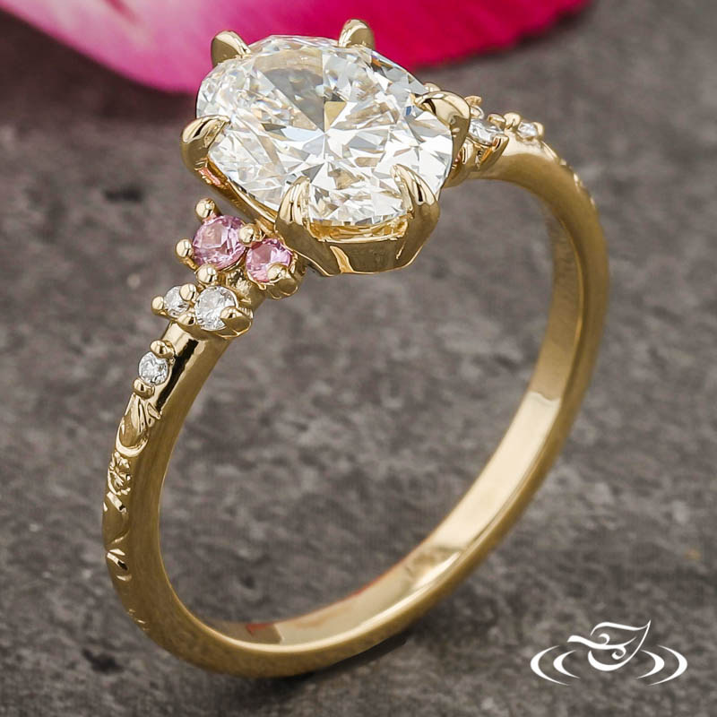 Custom 14kt yellow gold ring holding (1) GLJW provided oval cut lab diamond center stone 6-prong set with delicate pointed prongs. Each shoulder holds a total of (5) GLJW provided round cut melee, of varying size, prong set in a clustered orientation. These stones are comprised of (4) light pink sapphire melee and (6) lab diamond melee. The remainder of the ring is comprised of a round domed shank with a hand engraved floral and scroll pattern extending along the top face. All with a high polish finish.