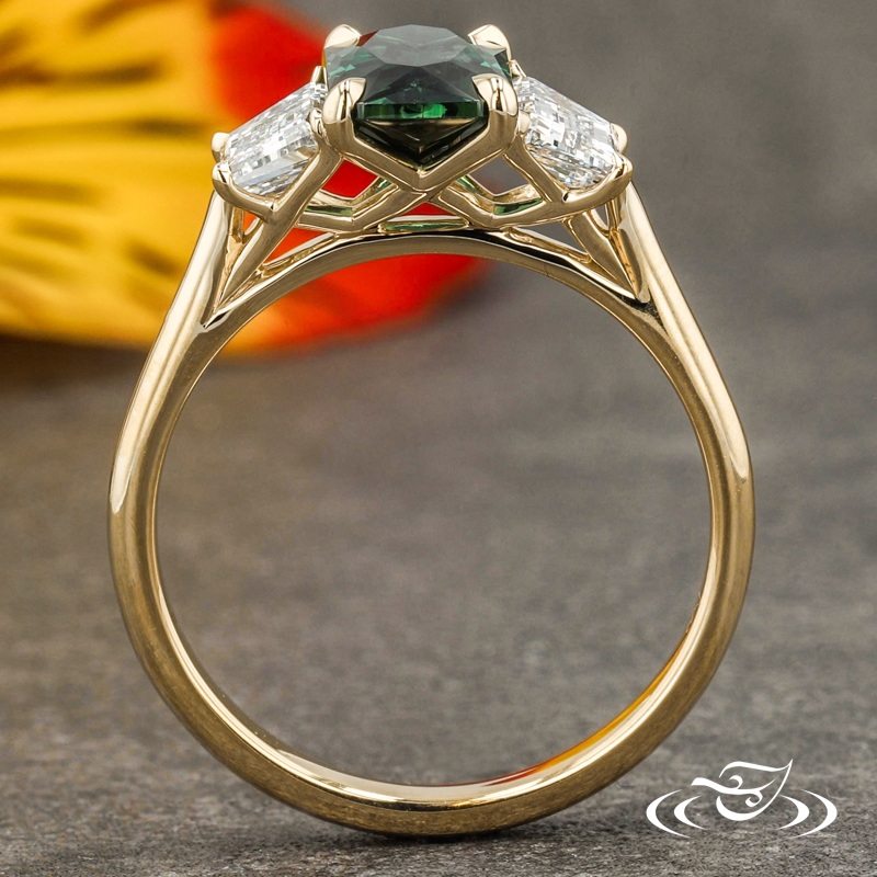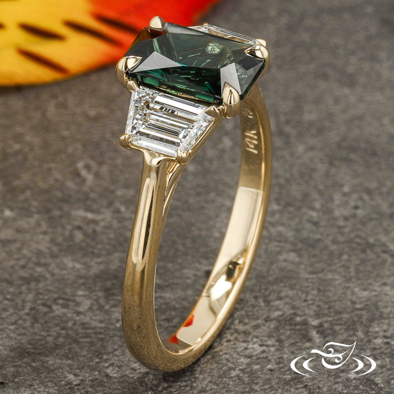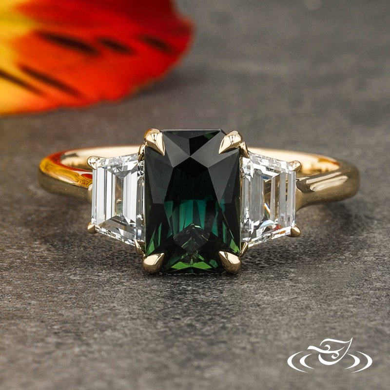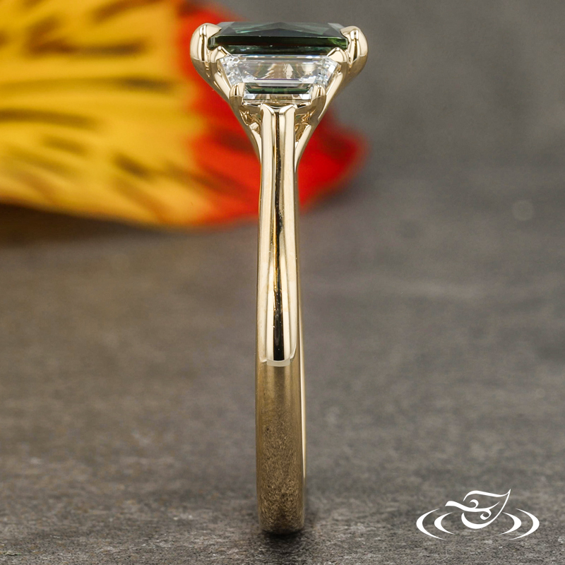 Custom 14kt yellow gold three stone ring holding a 4-prong set GLJW provided radiant teal sapphire center stone flanked by (1) GLJW provided trapezoid lab diamond stones 4-prong set on either shoulder. This ring also has a round reverse taper shank and a high polish finish.