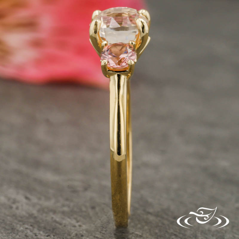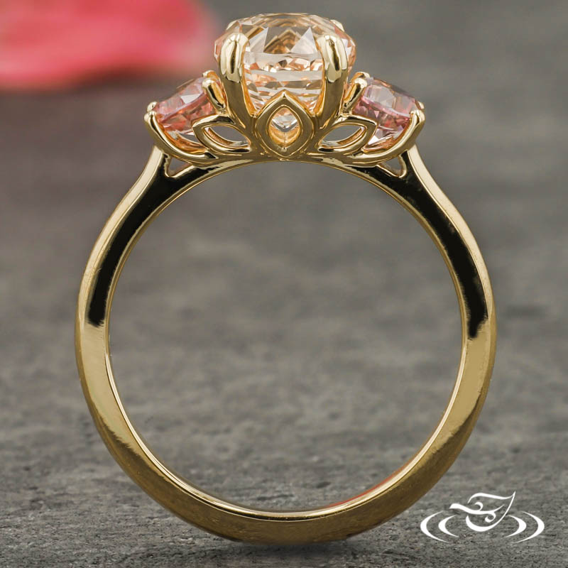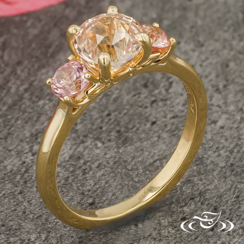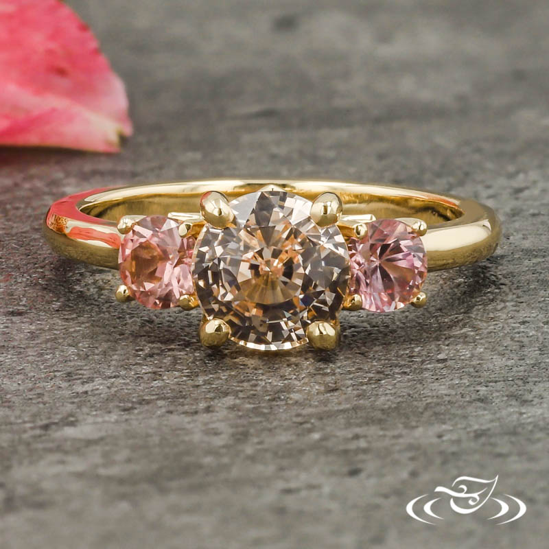 Custom 18kt yellow gold 3-stone ring holding a 4-prong set GLJW provided round sapphire center stone flanked by (1) GLJW provided round sapphire stone 4-prong set on either shoulder. This ring also has a round shank and a high polish finish.