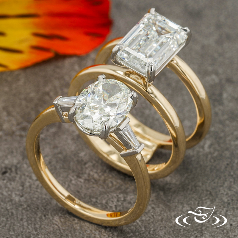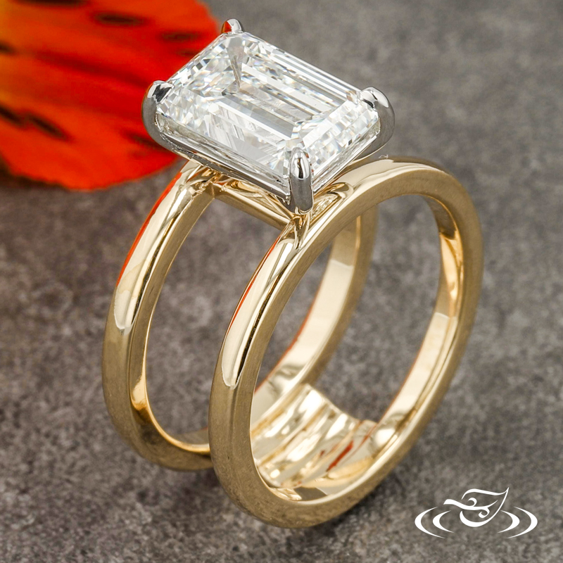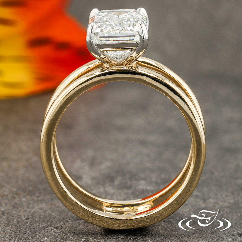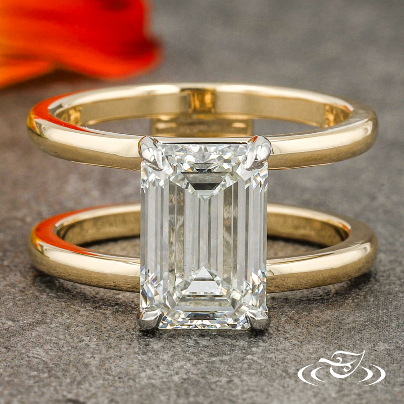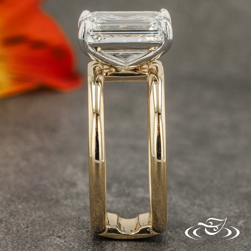 Custom 2 tone platinum and gold ring holding a GLJW provided emerald cut lab diamond center stone. This ring also has a double shank to fit custom wedding band inbetween and a high polish finish.
