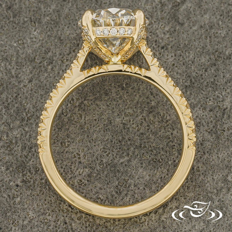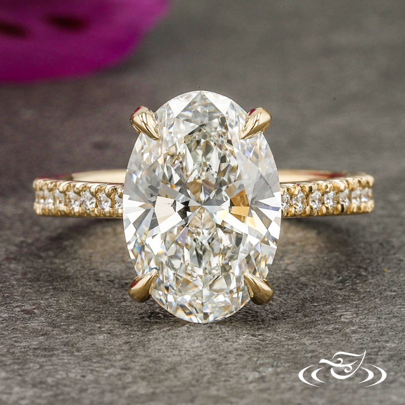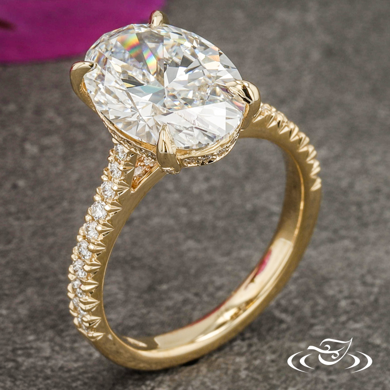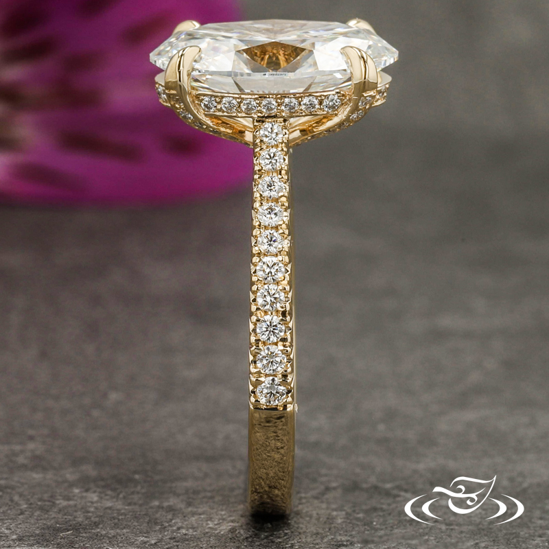 Custom 14kt yellow gold ring holding a 4-prong set GLJW provided oval lab diamond center stone. This ring also has a soft square shape reverse taper shank with Lab Diamonds french set halfway around. This Ring also features a hidden halo and Diamondds under the center stone and along the center stone prongs.