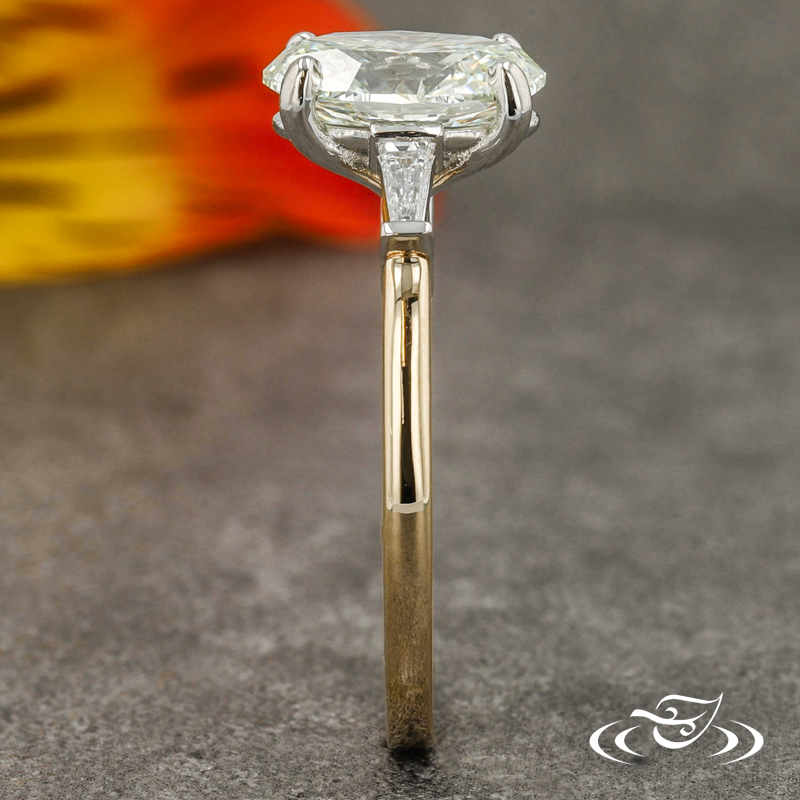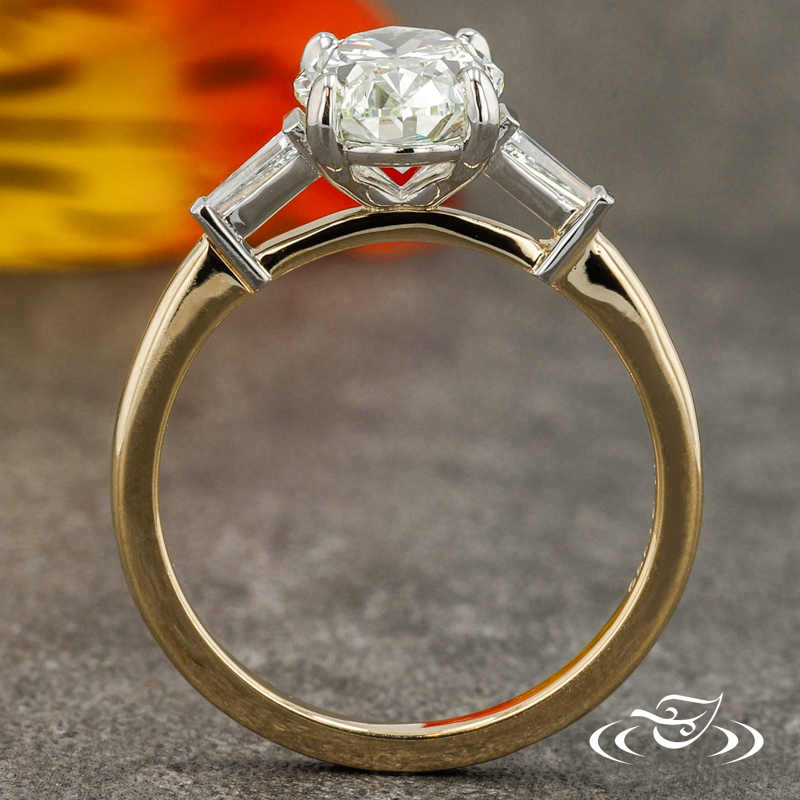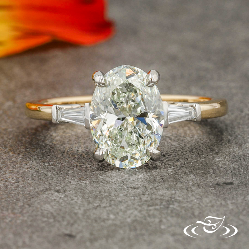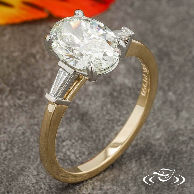 Custom two-tone ring with 950 platinum settings holding (1) GLJW provided oval cut diamond center stone 4-prong set with delicate pointed prongs. The center setting is flanked by (2) bar set GLJW provided tapered baguette cut lab diamond accent stones. The remainder of the ring is comprised of a 14k yellow gold round domed shank. All with a high polish finish.