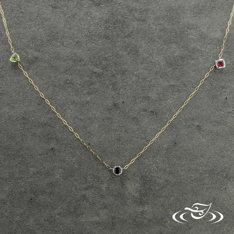 Custom assembled birthstone necklace comprised of a 1.3mm wide and 20" long 14k yellow gold paperclip chain. A total of (3) bezel settings were CAD/cast in 950 platinum to hold (1) trillion cut peridot, (1) round cut blue lab sapphire, and (1) cushion cut red lab ruby. The bezel with the blue lab sapphire is installed at the center of the chain while the peridot bezel and lab ruby bezel are installed 7" from the ends of the chain, (1) on each side. All finished in a high polish.