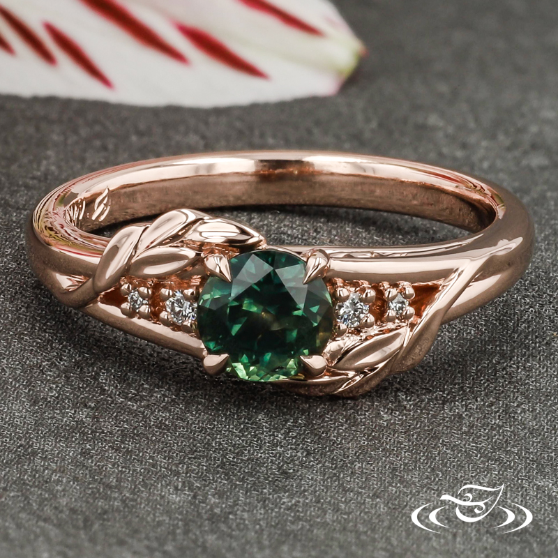 Custom 14kt rose gold organic style bypass ring holding a 4-prong set GLJW provided round sapphire center stone flanked by (2) GLJW provided round diamonds prong set on either shoulder. This ring features cast in place leaves wrapping around the center stone, as well as organic cast in place curls in the gallery. All with a round shank and a high polish finish.