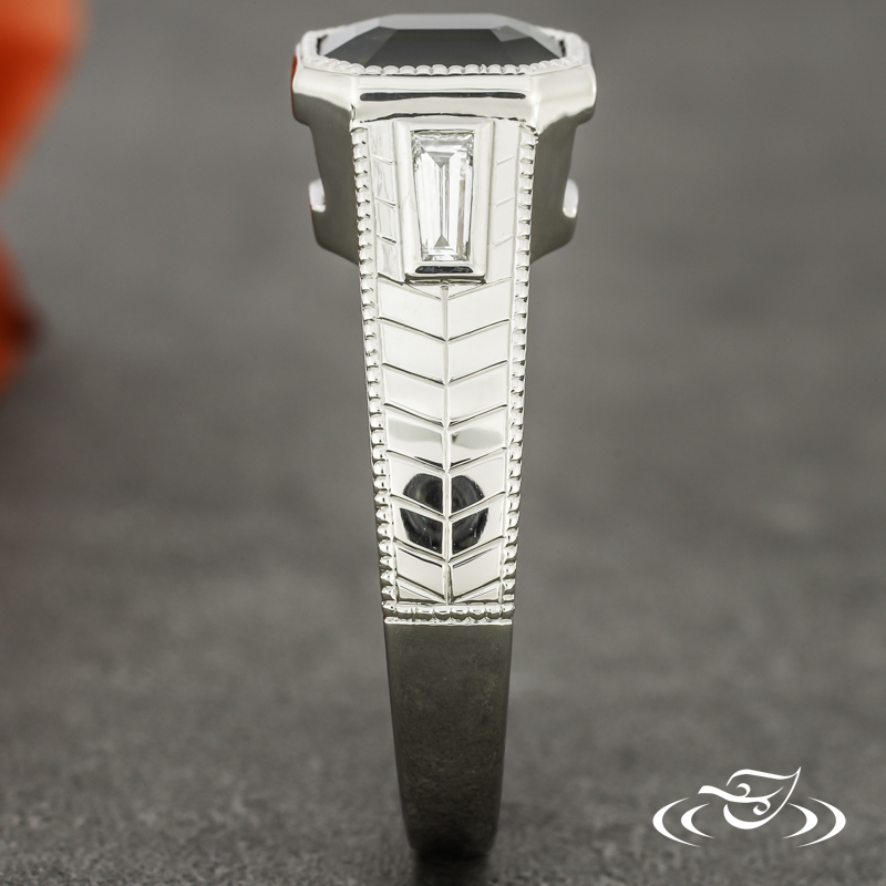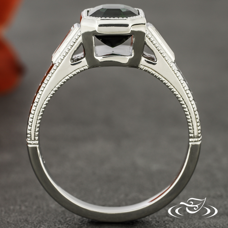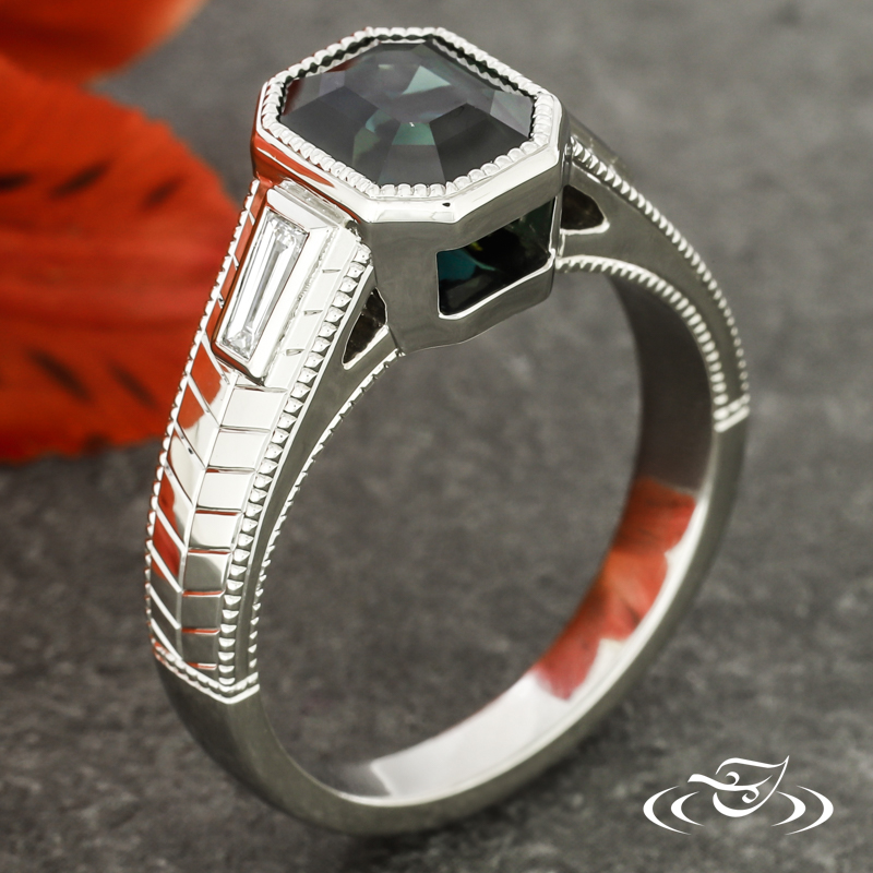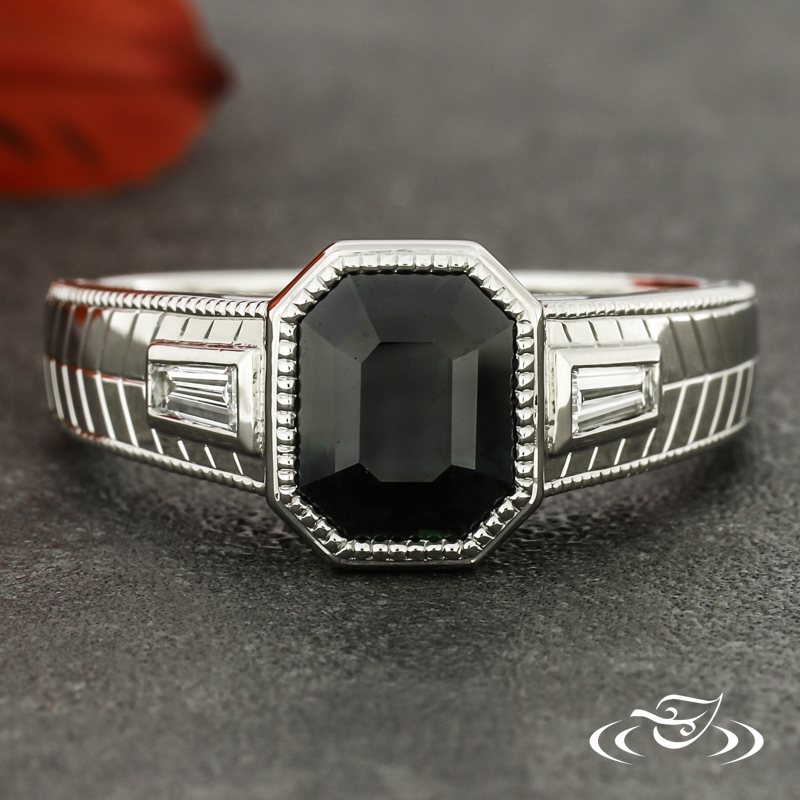Custom 950 platinum 3 stone ring holding a bezel set GLJW provided emerald cut sapphire center stone flanked by (1) GLJW provided tapered baguette lab diamond bezel set on either shoulder. This ring features a hand engraved minimalistic wheat engraving on the shank as well as milgrain edges going about half way around the shank. All with a round tapered shank and a high polish finish.