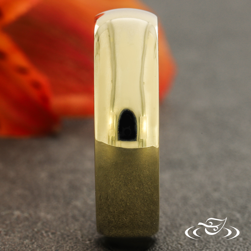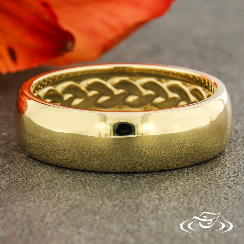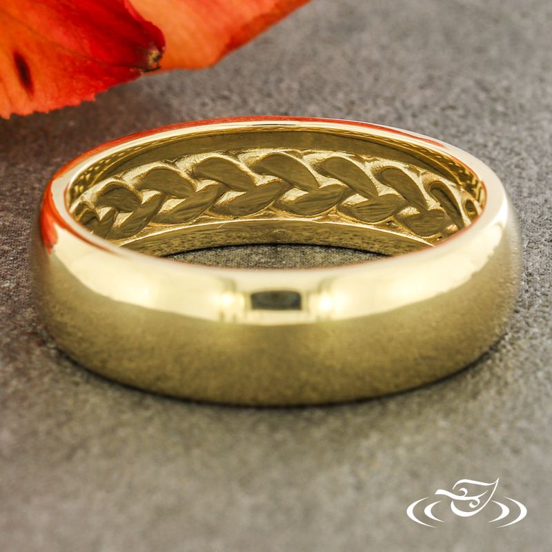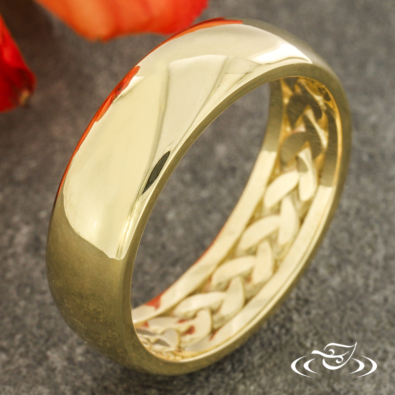 Custom Remake: 14k Yellow gold round domed band with a high polish finish. Interior features Cuban link motif, rendered in an eternity style around the center, and bordered on both sides by 1.3mm smooth polished rails.
